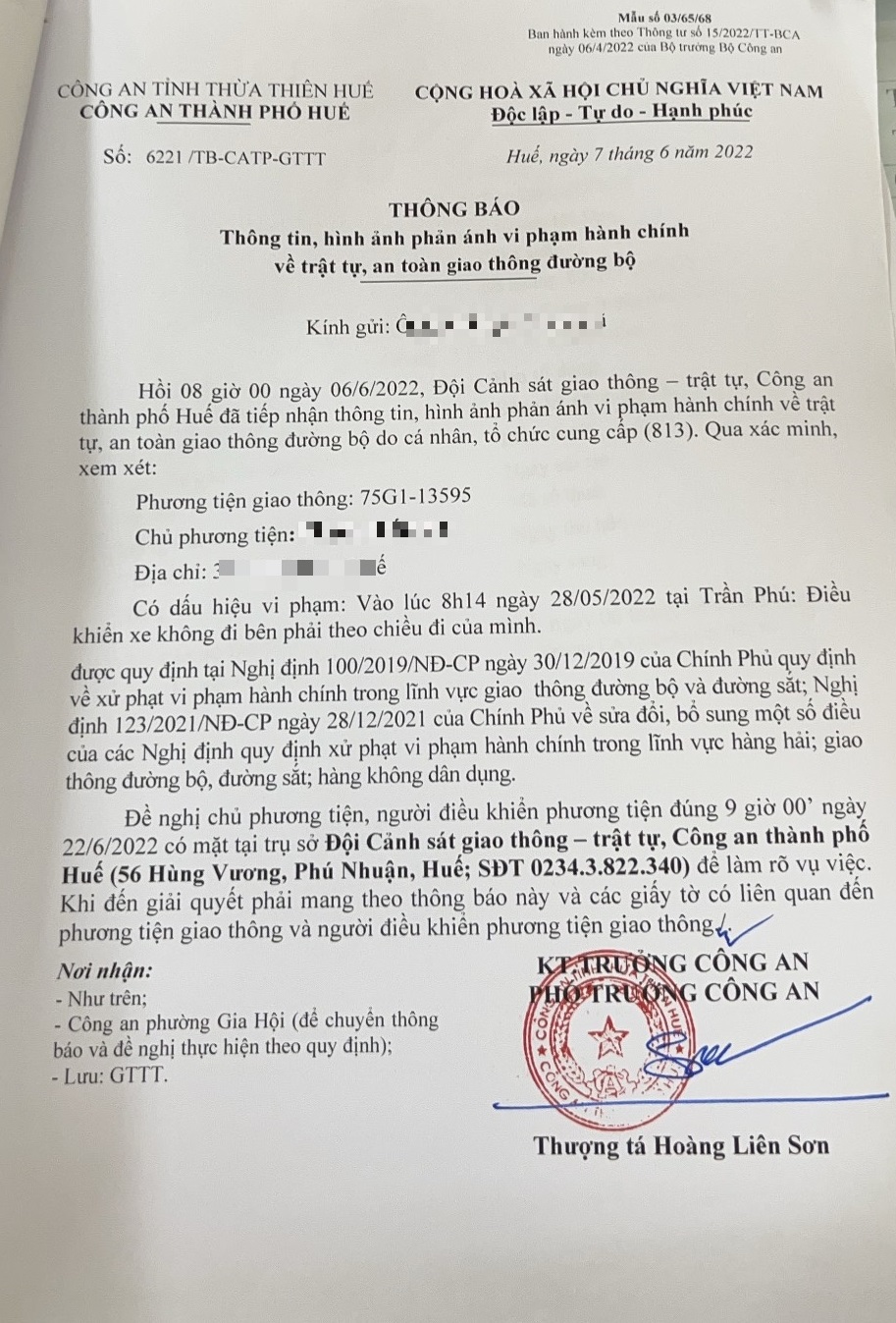 Công an thành phố đã lập hồ sơ, thông báo chủ phương tiện đến làm việc vào ngày 22/6/2022. Tuy nhiên, hiện chủ phương tiện vẫn chưa trình diện tại cơ quan. Công an thành phố Huế sẽ tiếp tục thông báo lực lượng tuần tra trên địa bàn, trong quá trình làm nhiệm vụ phát hiện, xử lý.