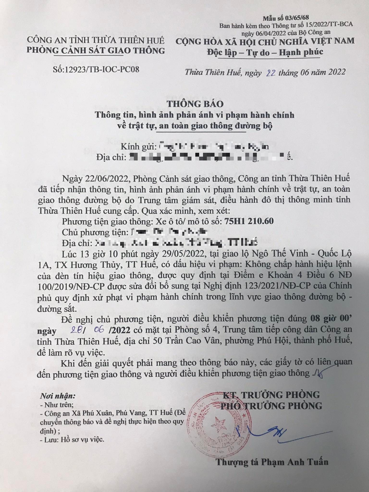 Vào lúc 13 giờ 10 phút ngày 29/05/2022, mô tô mang biển kiểm soát 75H121060 không chấp hành hiệu lệnh của đèn tín hiệu giao thông tại giao lộ Quốc Lộ 1A - Ngô Thế Vinh.