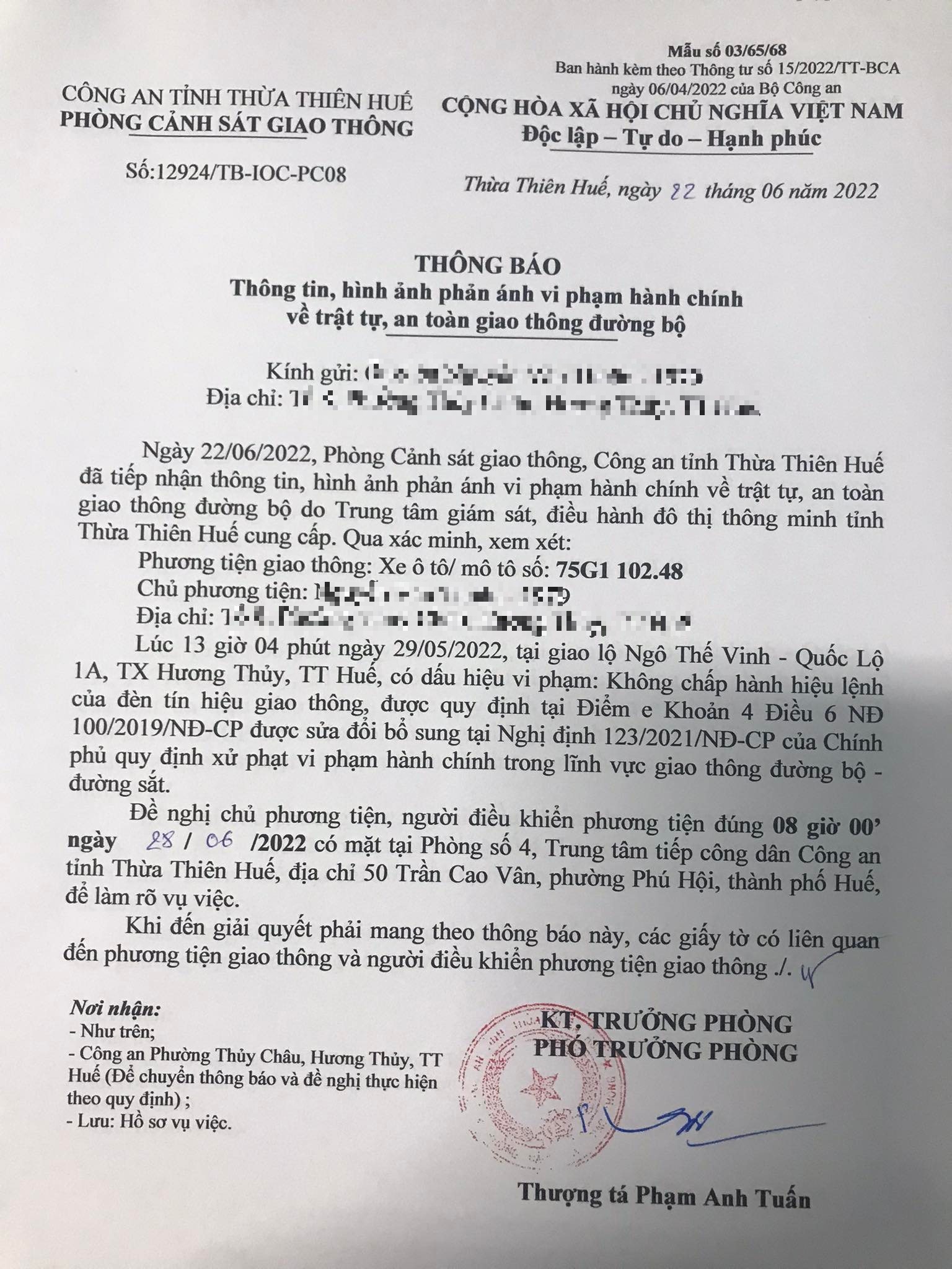 Vào lúc 13 giờ 04 phút ngày 29/05/2022, mô tô mang biển kiểm soát 75G110248 không chấp hành hiệu lệnh của đèn tín hiệu giao thông tại giao lộ Quốc Lộ 1A - Ngô Thế Vinh.