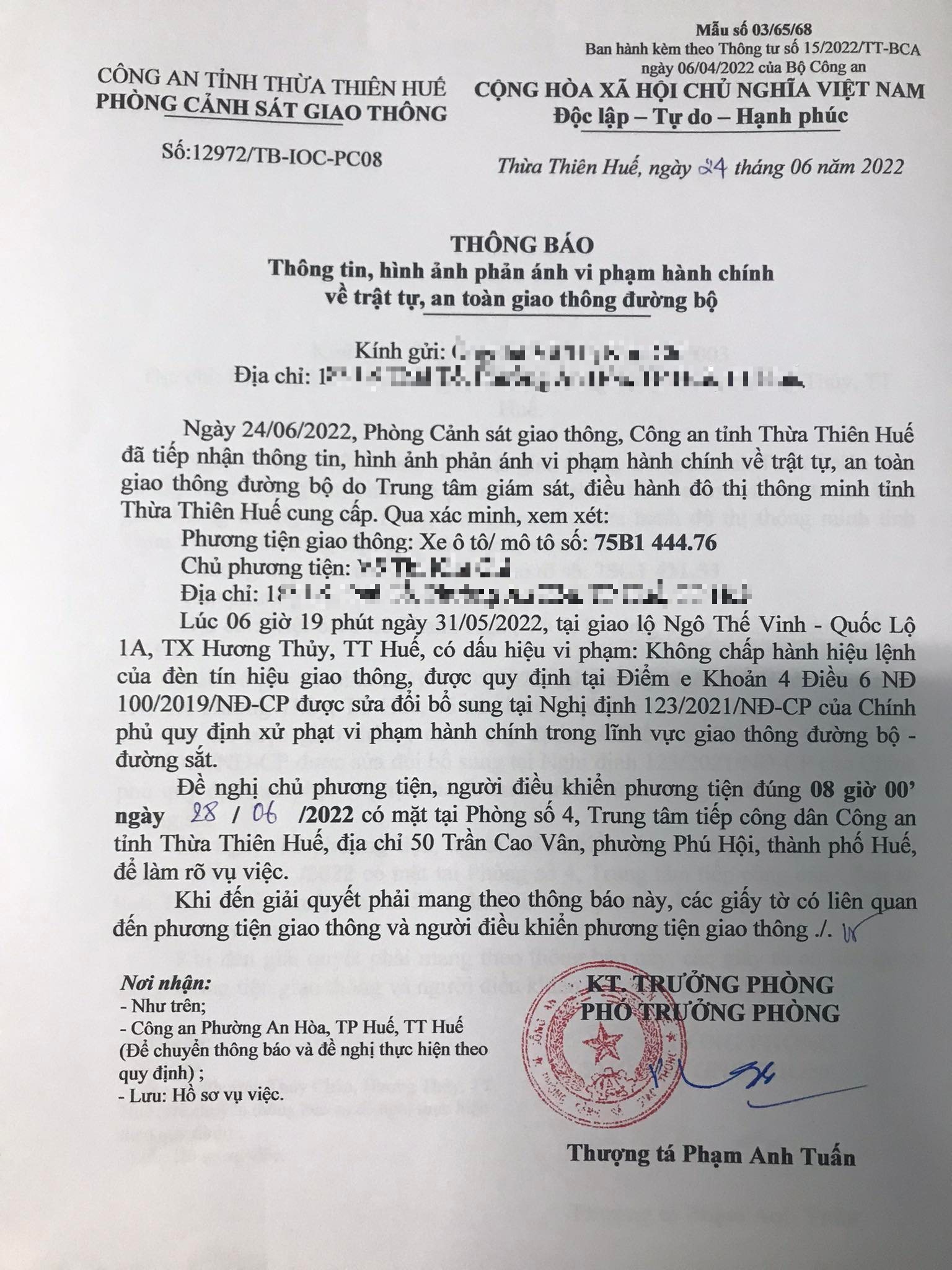 Vào lúc 06 giờ 19 phút ngày 31/05/2022, mô tô mang biển kiểm soát 75B144476 không chấp hành hiệu lệnh của đèn tín hiệu giao thông tại giao lộ Quốc Lộ 1A - Ngô Thế Vinh.