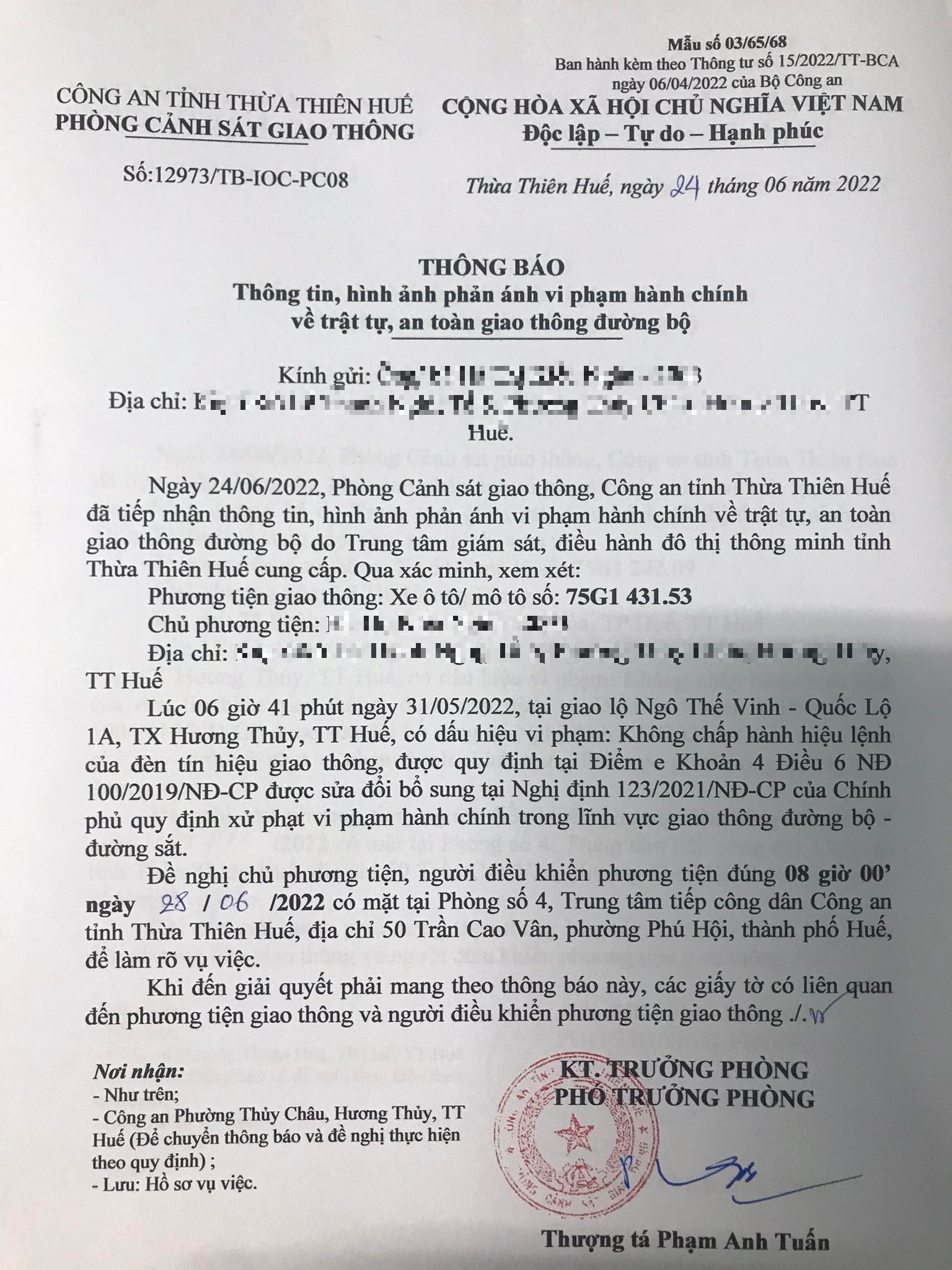 Vào lúc 06 giờ 41 phút ngày 31/05/2022, mô tô mang biển kiểm soát 75G143153 không chấp hành hiệu lệnh của đèn tín hiệu giao thông tại giao lộ Quốc Lộ 1A - Ngô Thế Vinh.