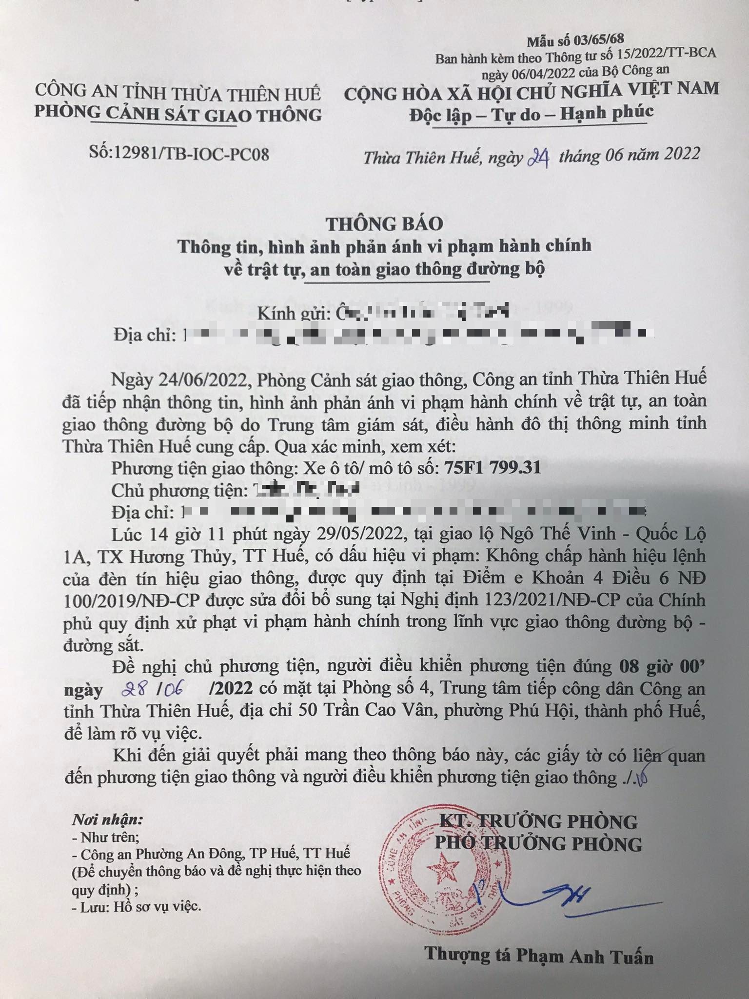 Vào lúc 14 giờ 11 phút ngày 29/05/2022, mô tô mang biển kiểm soát 75F179931 không chấp hành hiệu lệnh của đèn tín hiệu giao thông tại giao lộ Quốc Lộ 1A - Ngô Thế Vinh.