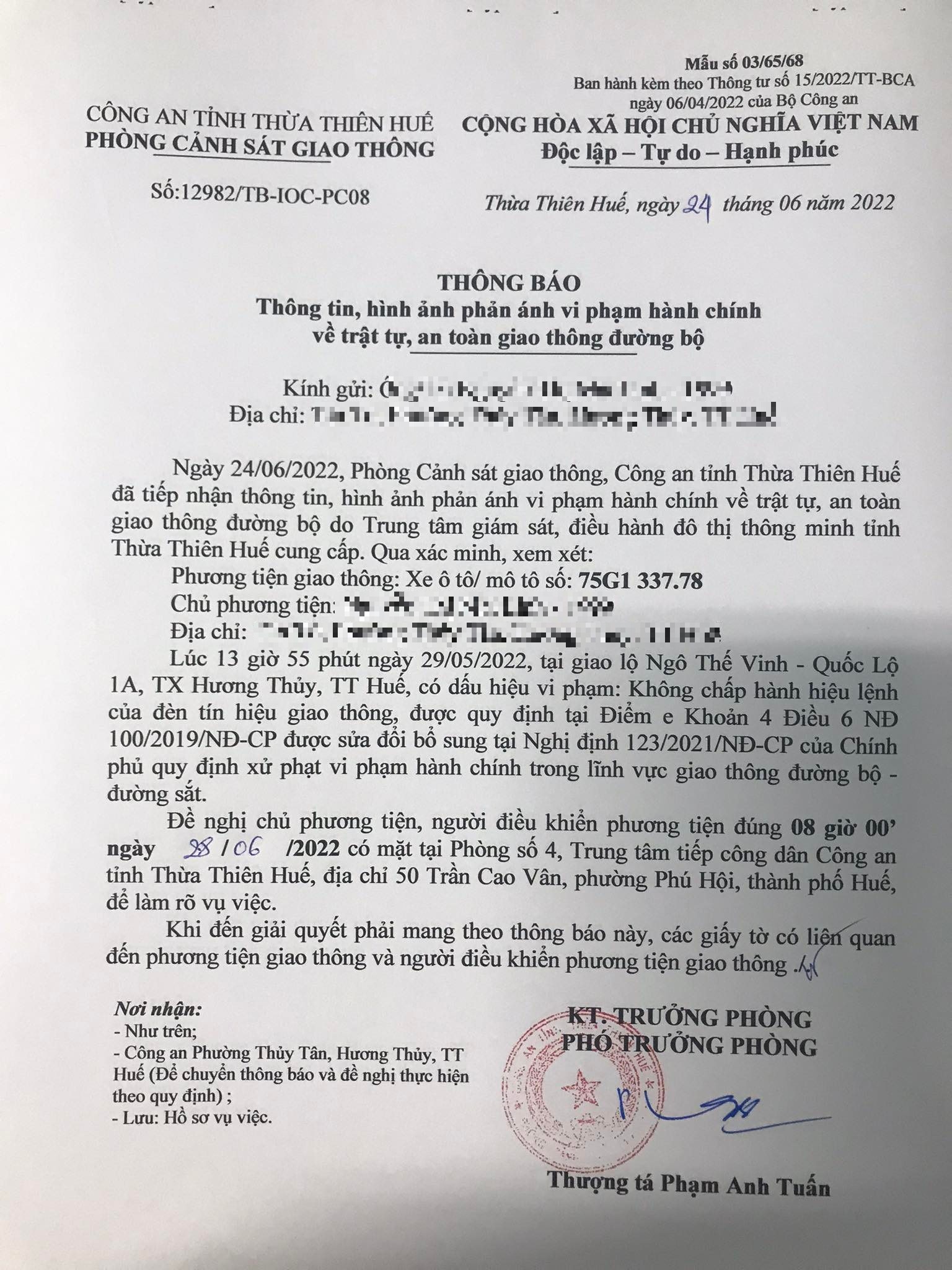 Vào lúc 13 giờ 55 phút ngày 29/05/2022, mô tô mang biển kiểm soát 75G133778 không chấp hành hiệu lệnh của đèn tín hiệu giao thông tại giao lộ Quốc Lộ 1A - Ngô Thế Vinh.