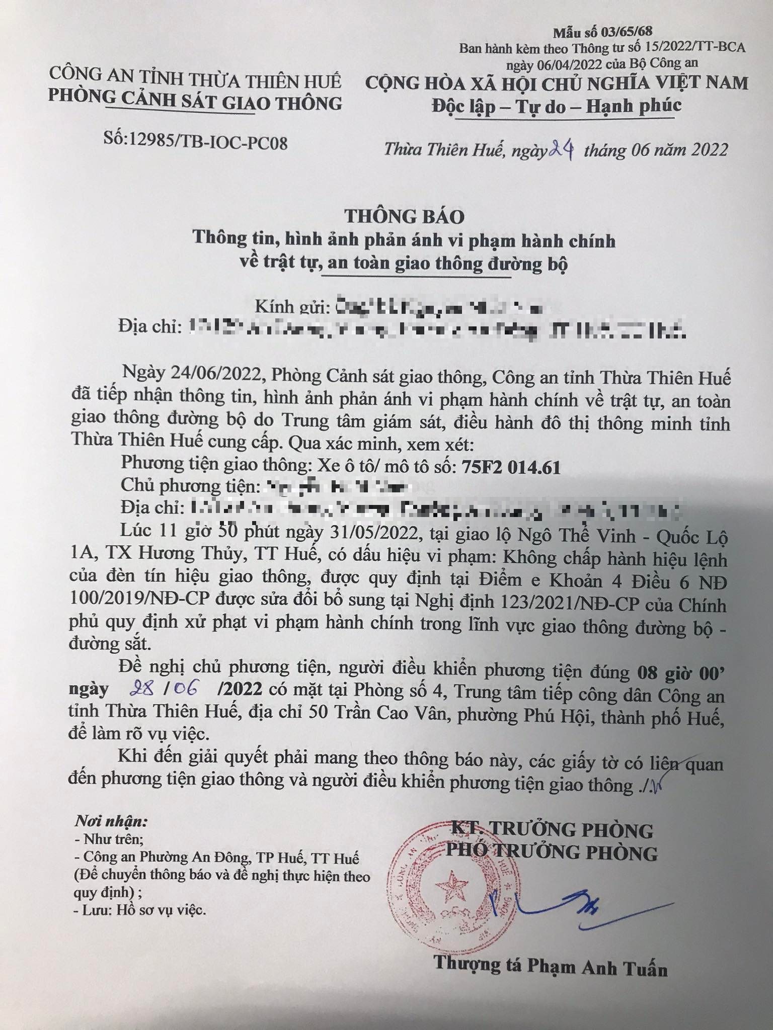 Vào lúc 11 giờ 50 phút ngày 31/05/2022, mô tô mang biển kiểm soát 75F201461 không chấp hành hiệu lệnh của đèn tín hiệu giao thông tại giao lộ Quốc Lộ 1A - Ngô Thế Vinh.