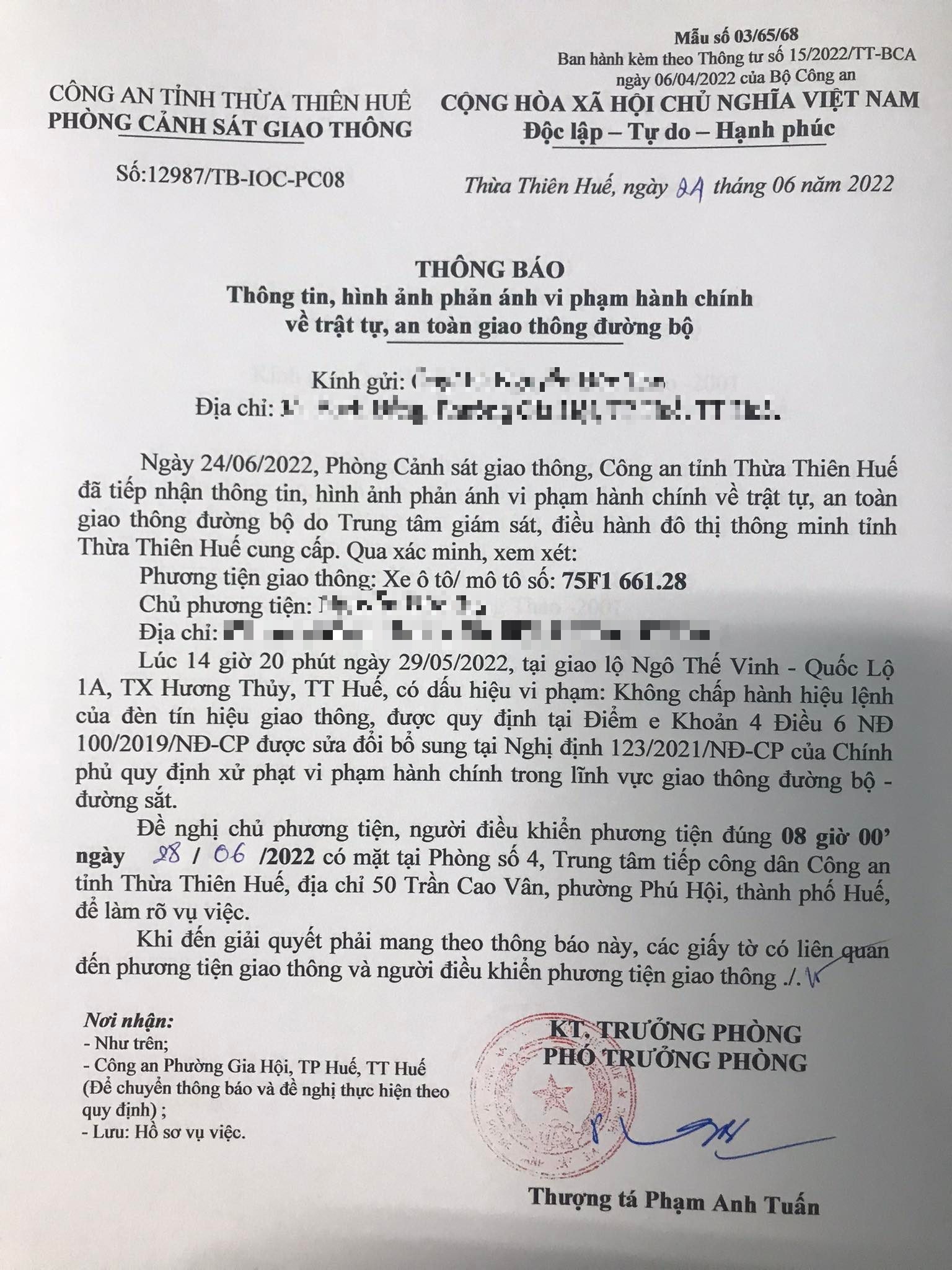Vào lúc 14 giờ 20 phút ngày 29/05/2022, mô tô mang biển kiểm soát 75F166128 không chấp hành hiệu lệnh của đèn tín hiệu giao thông tại giao lộ Quốc Lộ 1A - Ngô Thế Vinh.
