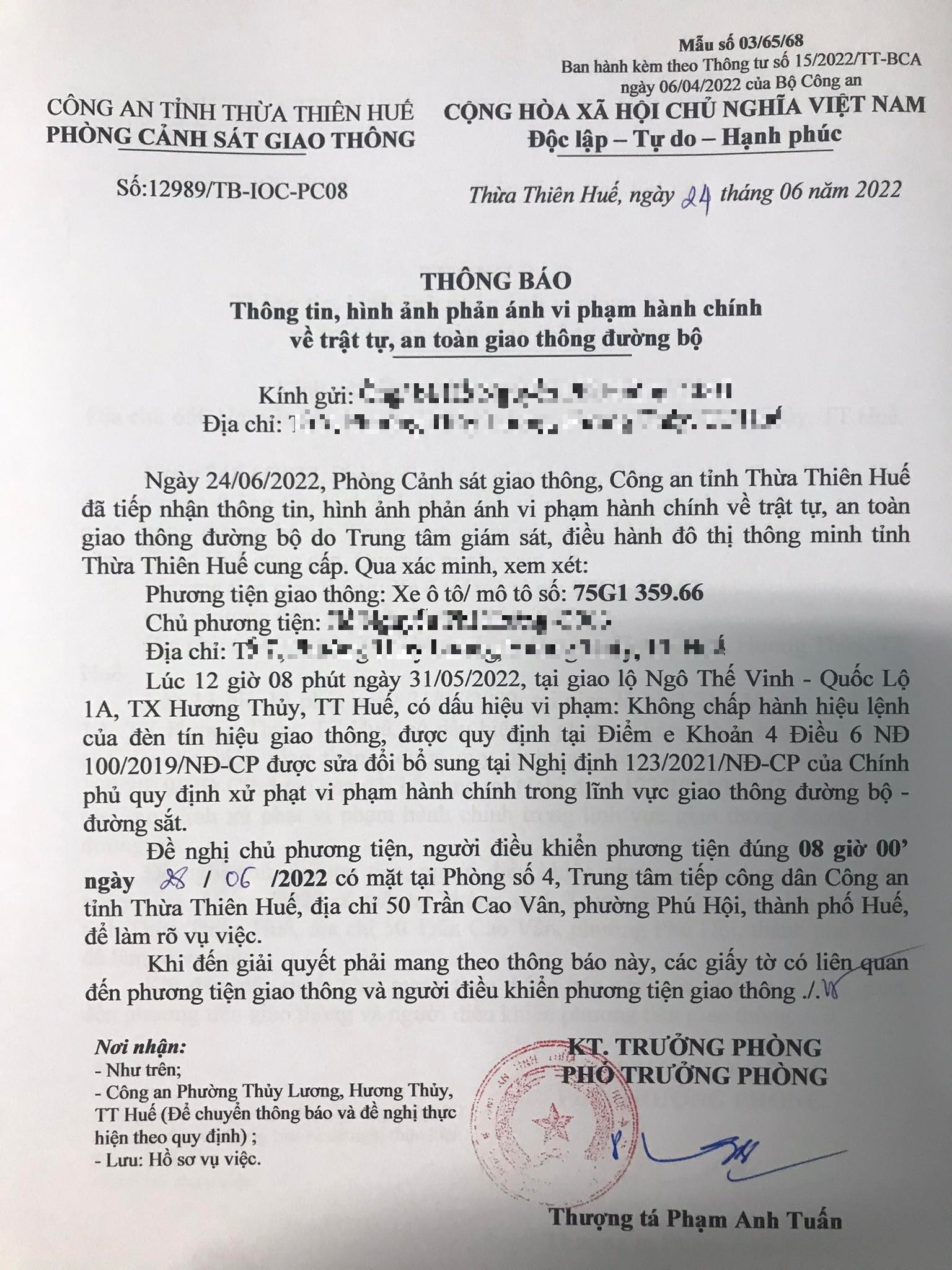 Vào lúc 12 giờ 08 phút ngày 31/05/2022, mô tô mang biển kiểm soát 75G135966 không chấp hành hiệu lệnh của đèn tín hiệu giao thông tại giao lộ Quốc Lộ 1A - Ngô Thế Vinh.