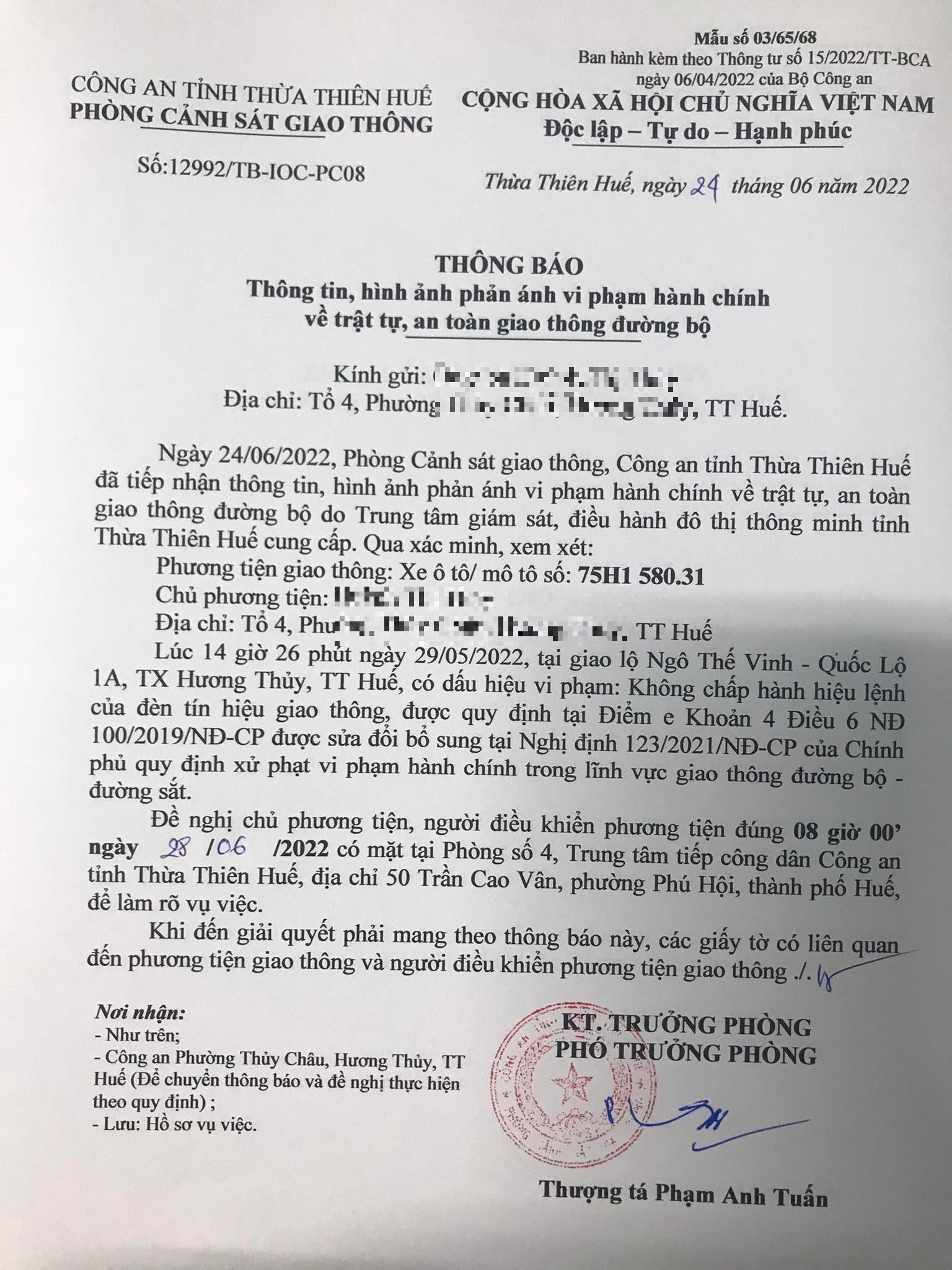 Phòng Cảnh sát giao thông xác định lỗi vi phạm của người điều khiển phương tiện 75H158031: Không chấp hành hiệu lệnh của đèn tín hiệu giao thông, quy định tại điểm e khoản 4 điều 6 Nghị định 100/2019/NĐ-CP được sửa đổi, bổ sung tại Nghị định 123/NĐ-CP ngày 28/12/2021.