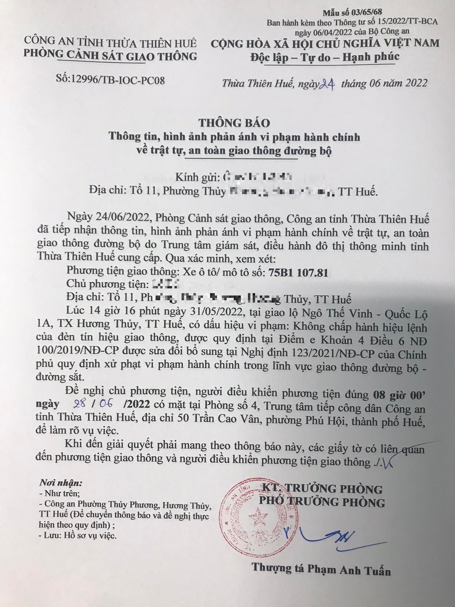 Vào lúc 14 giờ 16 phút ngày 31/05/2022, mô tô mang biển kiểm soát 75B110781 không chấp hành hiệu lệnh của đèn tín hiệu giao thông tại giao lộ Quốc Lộ 1A - Ngô Thế Vinh.