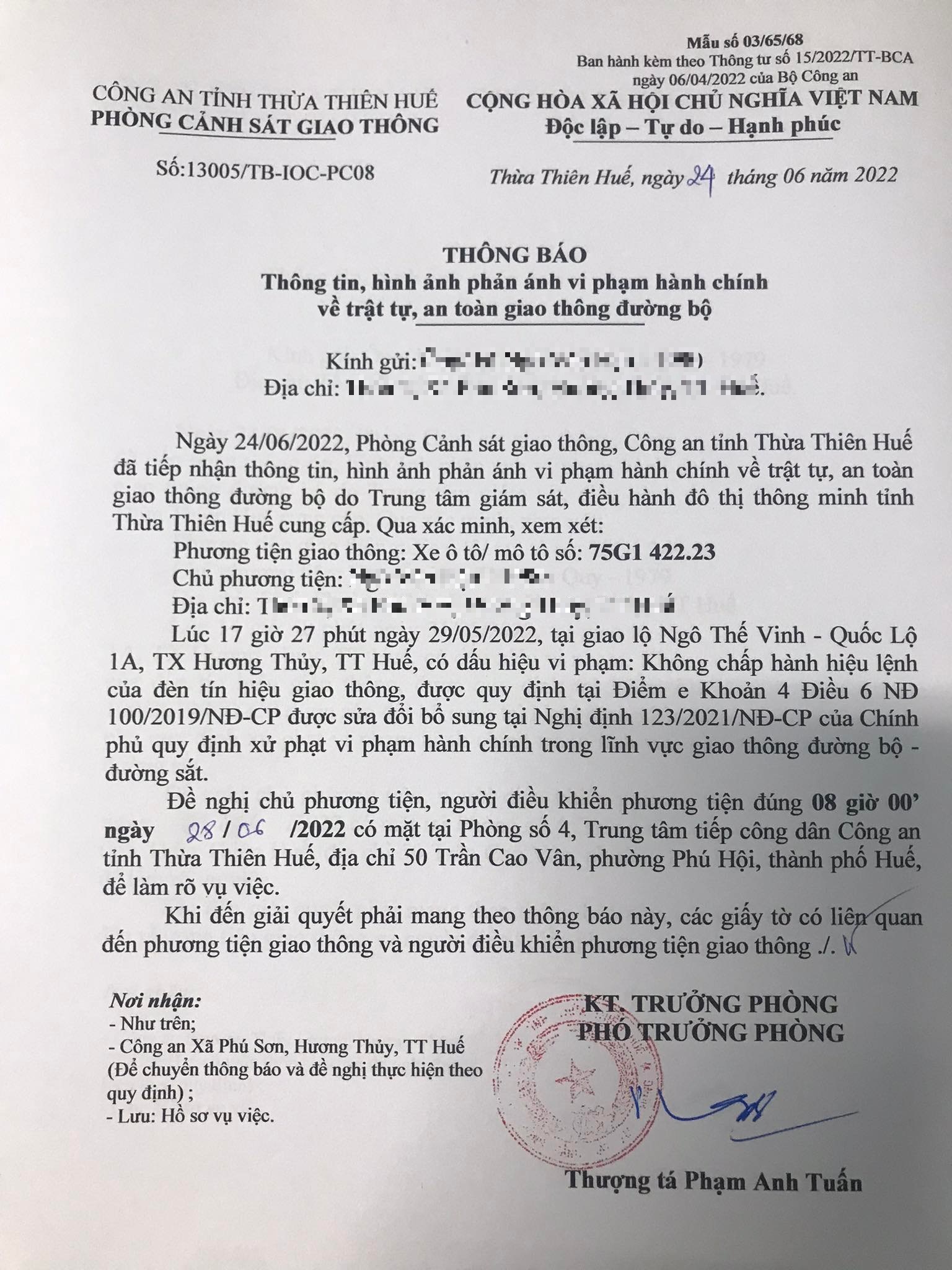 Vào lúc 17 giờ 27 phút ngày 29/05/2022, mô tô mang biển kiểm soát 75G142223 không chấp hành hiệu lệnh của đèn tín hiệu giao thông tại giao lộ Quốc Lộ 1A - Ngô Thế Vinh.