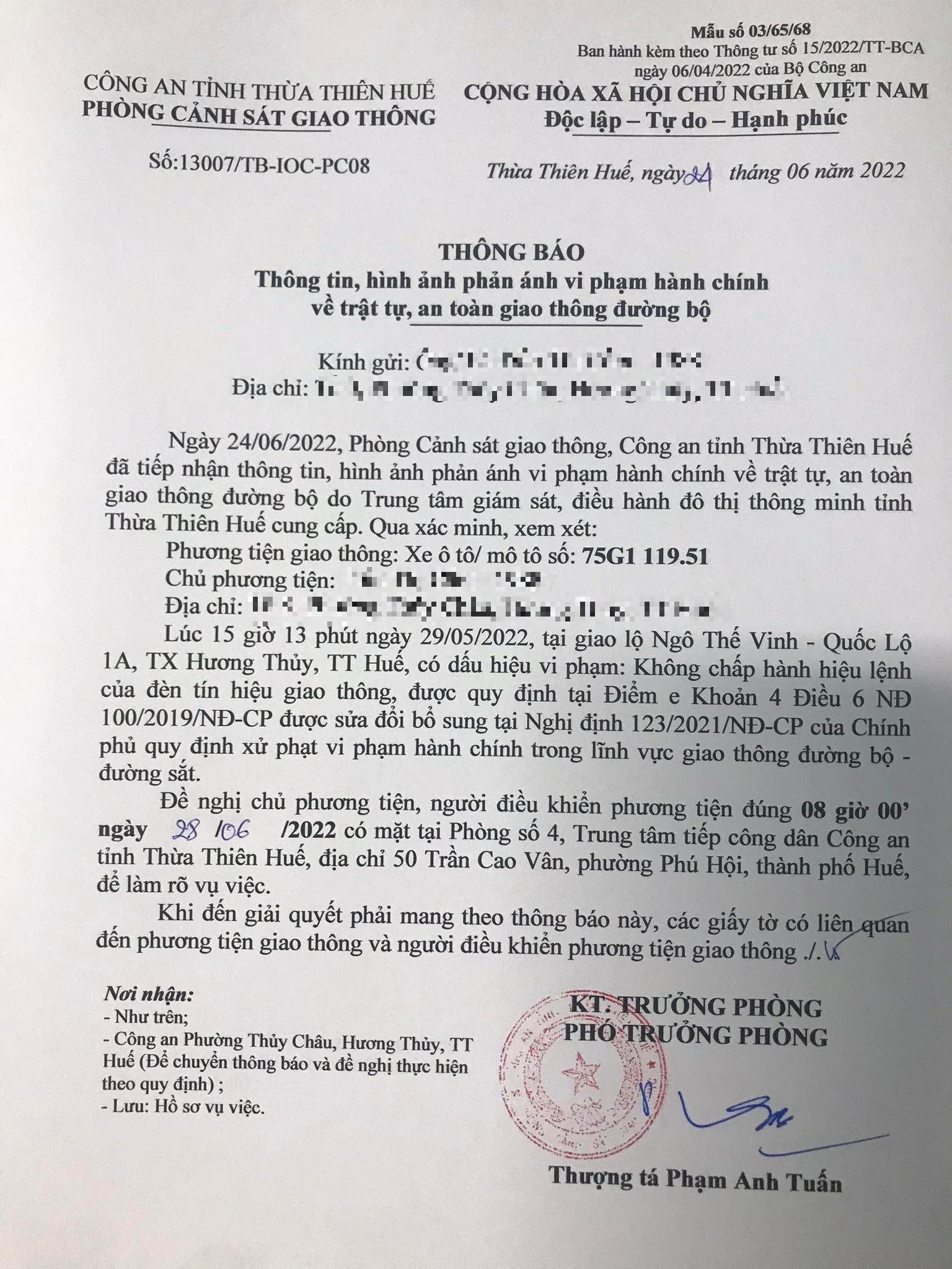 Vào lúc 15 giờ 13 phút ngày 29/05/2022, mô tô mang biển kiểm soát 75G111951 không chấp hành hiệu lệnh của đèn tín hiệu giao thông tại giao lộ Quốc Lộ 1A - Ngô Thế Vinh.