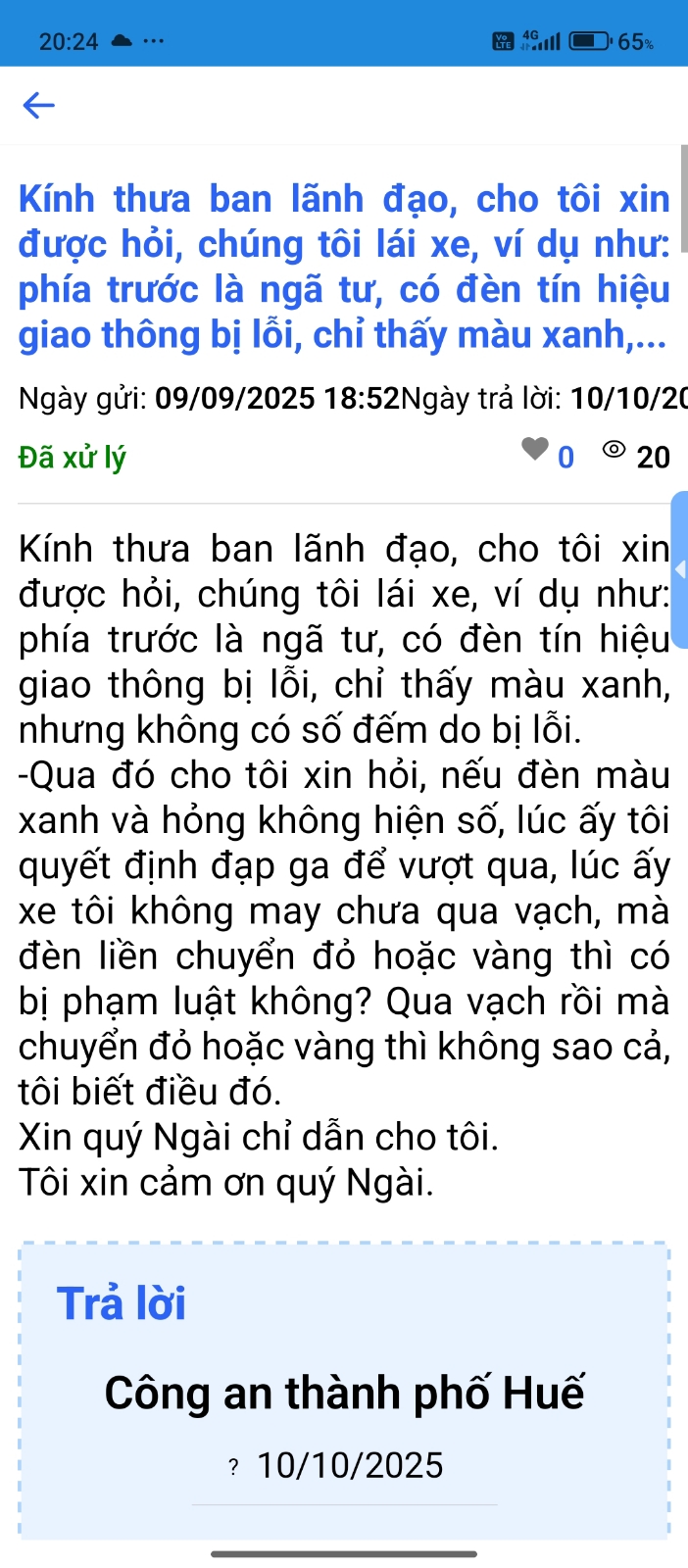 Kính thưa ban lãnh đạo, lần trước tôi có hỏi về vấn đề đèn tín hiệu nếu bị hỏng vào 9-9-2025, sau khi nhận được câu trả lời của cơ quan chức năng, tôi rất vui nhưng vẫn còn thắc mắc, cần được sự hướng dẫn từ ban lãnh đạo.