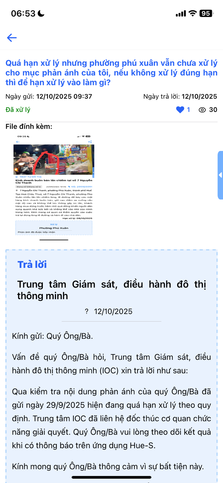 Qua kiểm tra, nội dung phản ánh của quý Ông/Bà đã gửi ngày 29/09/2025 hiện đang quá hạn xử lý theo quy định. Phản ánh này cũng được quý Ông/Bà gửi lại và Trung tâm IOC đã tiếp nhận ngày 14/10/2025. Hiện Trung tâm IOC đã liên hệ đốc thúc cơ quan chức năng giải quyết. Quý Ông/Bà vui lòng theo dõi kết quả khi có thông báo trên ứng dụng Hue-S.