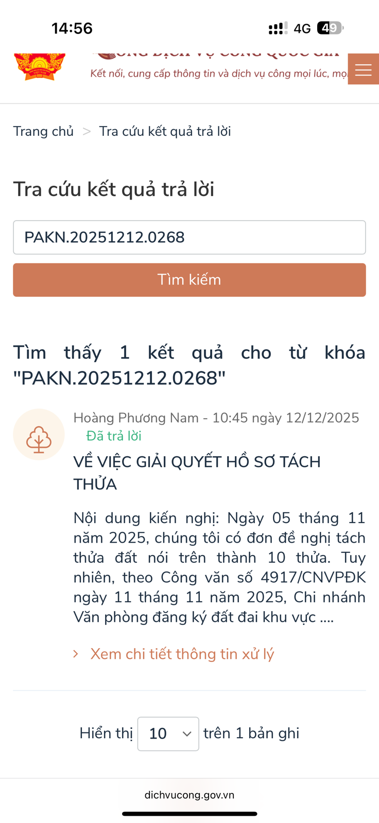 Đối với trường hợp xem kết quả trên Cổng dịch vụ công Quốc gia bị lỗi, quý Ông/Bà vui lòng liên hệ Tổng đài Cổng Dịch vụ công Quốc gia theo số điện thoại 18001096 để được hỗ trợ, hướng dẫn theo quy định.