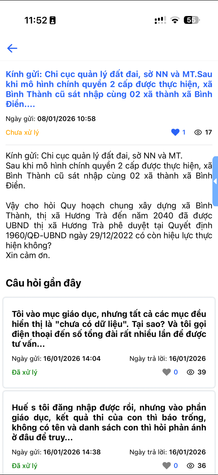 Qua kiểm tra nội dung câu hỏi quý Ông/Bà gửi ngày 08/01/2026 đang chuyển đến Sở xây dựng thành phố Huế và vẫn đang trong thời hạn trả lời (thời hạn trả lời ngày 20/01/2026). Quý Ông/Bà vui lòng chờ kết quả trả lời ở chuyên mục "Hỏi cơ quan nhà nước" khi có thông báo trên ứng dụng Hue-S.