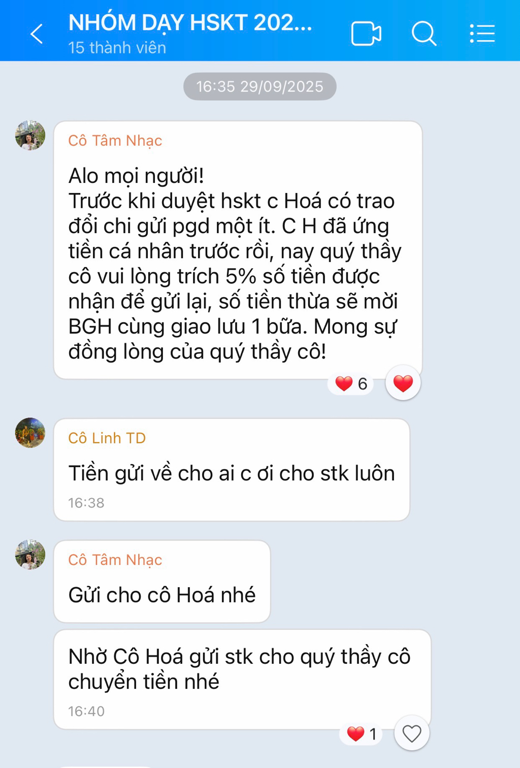 2/ Tháng 9/2025, khi thực hiện công tác thanh toán chế độ cho một số GV dạy HS khuyết tật trong năm học 2024 - 2025 của trường, Phó Hiệu trưởng nhà trường phụ trách công tác này là bà Cao Thị Mỹ Hóa đã lập một nhóm Zalo gồm 15/16 GV (thiếu 1 GV) được thanh toán chế độ này nhằm mục đích thông báo quán triệt và thực hiện trích thu 5% chế độ được hưởng của từng GV với lí do “chi gửi Phòng Giáo dục một ít”.