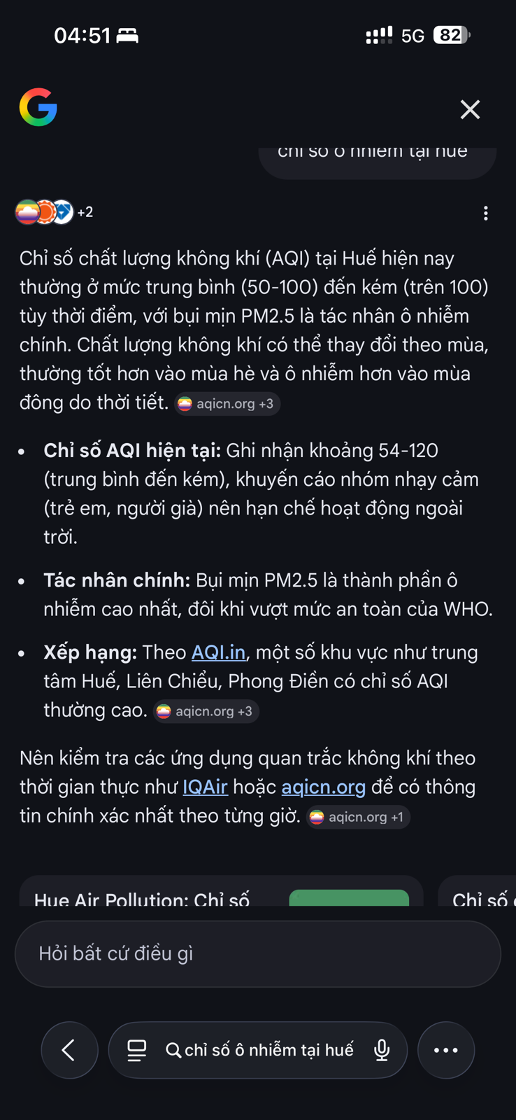 Là một công dân sống và lơn lên ở Huế tôi thật sự cảm thấy rất buồn về tình trạng càng ngày càng ô nhiễm của một thành phố vừa mới được công nhận là thành phố Xanh năm ngoái là Huế của mình đây. Thực sự từng ấy năm lớn lên ở Huế lần đầu tiên tôi cảm nhận được sự xuống cấp nghiêm trọng của tình hình ô nhiễm không khí tại Huế rõ ràng đến vậy. Bầu trời của Huế nó trở nên xám xịt dù trời nắng. Chỉ số ô nhiễm không khí lên tận 54-120. Sắp đạt ngưỡng bị ô nhiễm. Nguyên nhân do đâu tôi đề nghị cơ quan nhà nươc phải làm việc. Chứ không thể để Huế một tỉnh đang được quảng bá với tên THÀNH PHỐ XANH , Huế từng trong xanh trở nên ô nhiễm như này được!!!!