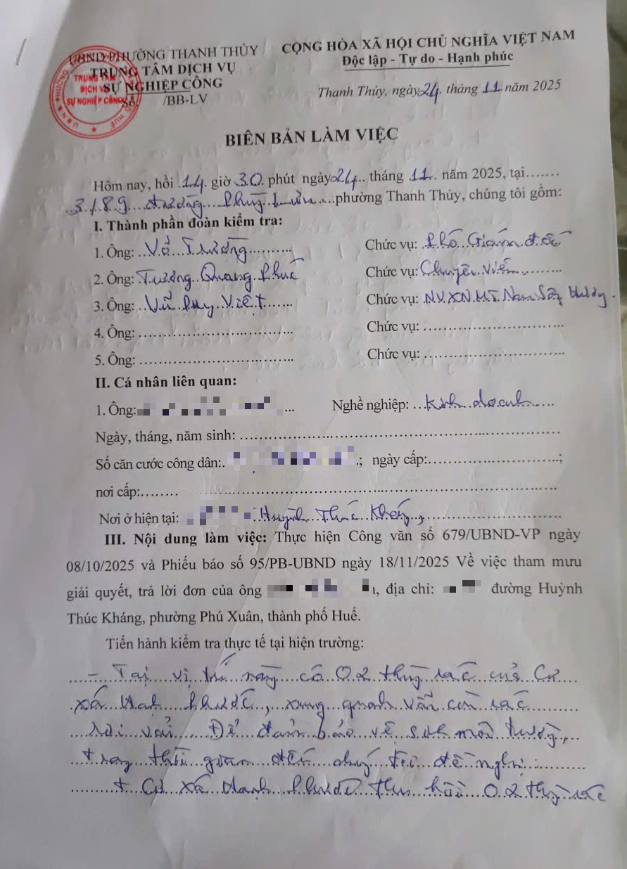 Vấn đề này đã được Trung tâm Dịch vụ sự nghiệp công phường làm việc với chủ cư xá Hạnh Phước là ông T.V.M. Qua đó, đề nghị ông M thu hồi 02 thùng rác tại khu vực phản ánh. Đồng thời, kiến nghị Công ty Cổ phần Môi trường và công trình đô thị Huế cử người tổng vệ sinh khu vực trên (Có biên bản làm việc kèm theo).