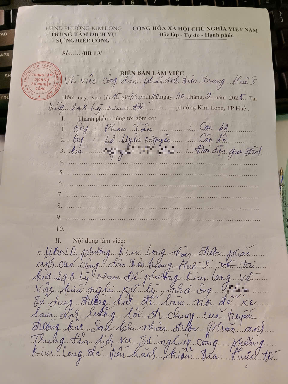 Qua kiểm tra thực tế tại kiệt 248 Lý Nam Đế, phường Kim Long, Tổ kiểm tra xác định hộ gia đình ông T thường xuyên để xe máy trước nhà, tại vị trí là lối đi chung của tuyến kiệt, gây cản trở việc đi lại của các hộ dân xung quanh. Đại diện gia đình, bà N.T.H, trình bày do diện tích nhà ở chật hẹp, con đông nên có để một số xe máy tại lối đi chung.