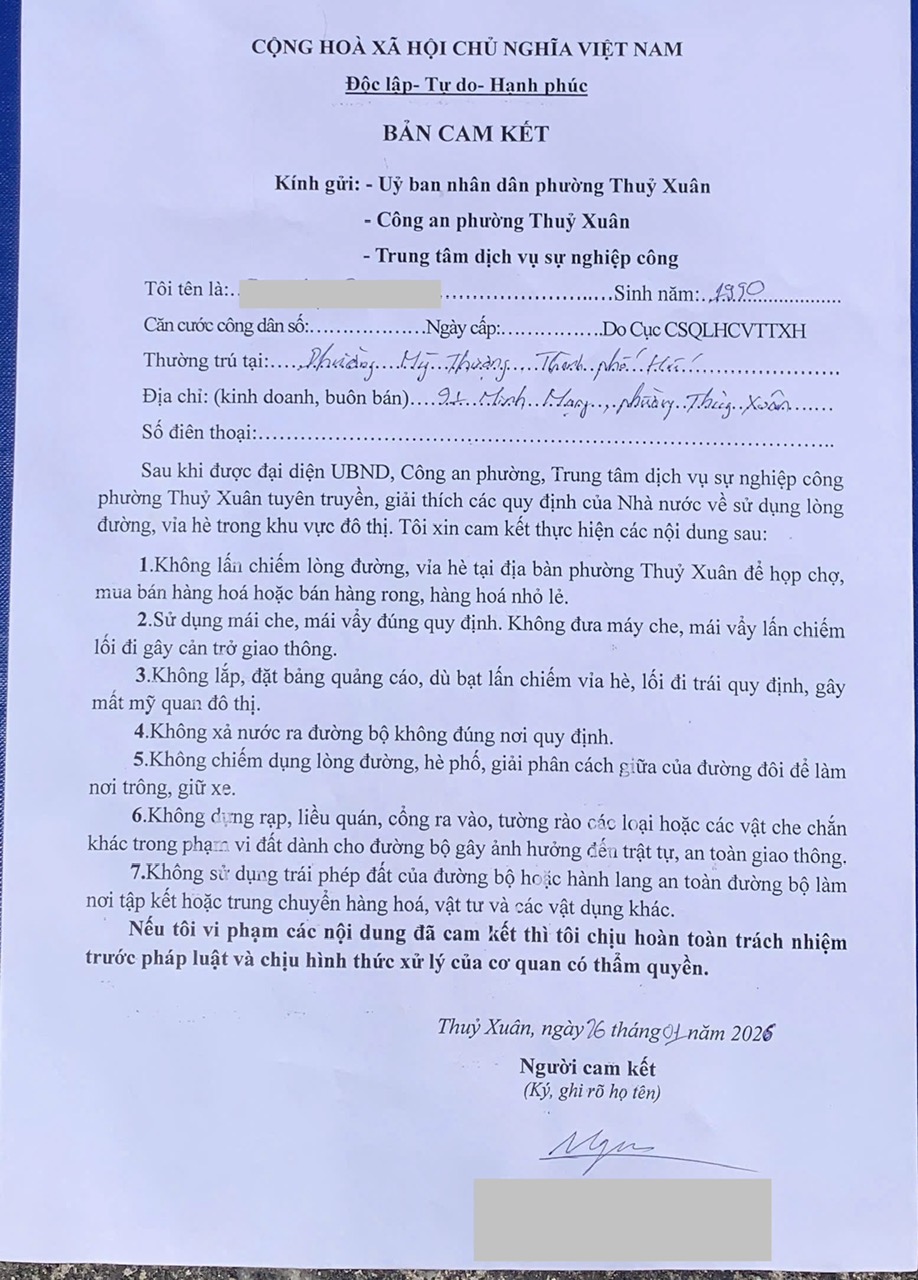 Trung tâm Dịch vụ sự nghiệp công phường Thuỷ Xuân tiến hành kiểm tra và tuyên truyền giải thích các quy định của Nhà nước về sử dụng lòng lề đường, vỉa hè trong khu vực đô thị và đã cho viết bản cam kết về việc chấp hành các quy định trên (đính kèm bản cam kết).