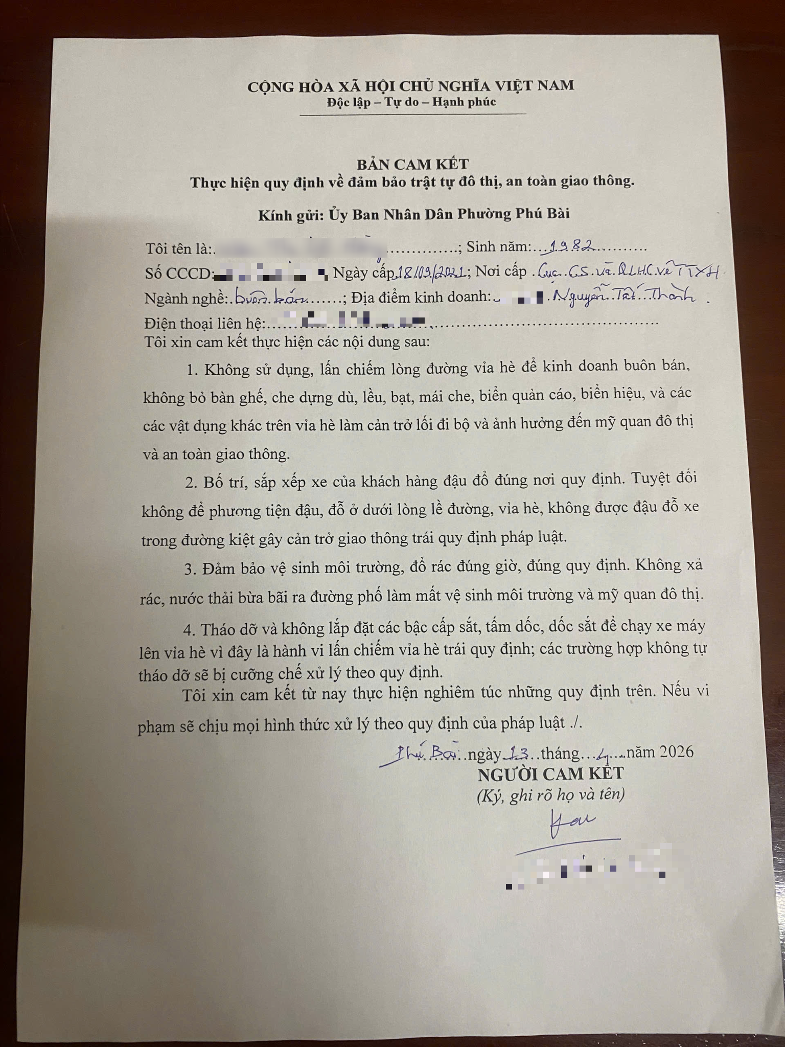 Sau khi tiếp nhận phản ánh về việc buôn bán lấn chiếm vỉa hè tại địa chỉ 1219 đường Nguyễn Tất Thành, Trung tâm Dịch vụ sự nghiệp công phường Phú Bài đã tiến hành kiểm tra. Qua kiểm tra, hộ dân liên quan đã được nhắc nhở, lập biên bản và ký cam kết thu dọn bàn ghế, không lấn chiếm lòng đường, vỉa hè để kinh doanh (có hình ảnh kèm theo).