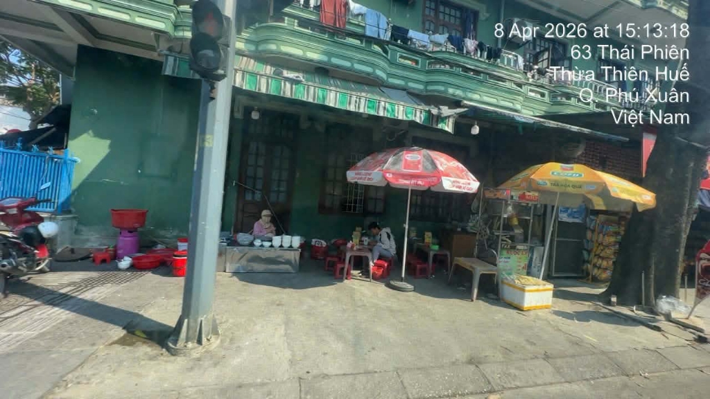 Vỉa hè 63 Thái Phiên, phường Phú Xuân (ngay cột đèn xanh đèn đỏ ngã tư Thái Phiên - Nguyễn Trãi) Quán bánh canh và quán nước mía thường xuyên chiếm dụng vỉa hè để kinh doanh. Đặt để bảng hiệu và bàn ghế làm khuất tầm nhìn tại giao lộ khiến người đi đường không thể quan sát khi tham gia giao thông.