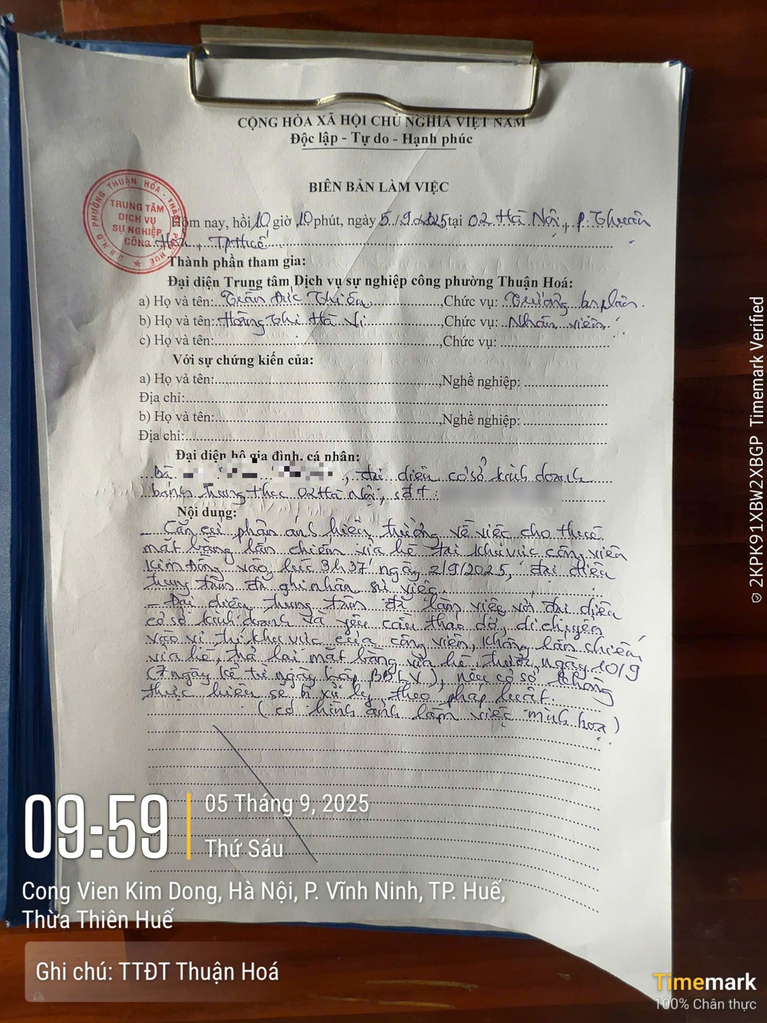 Trung tâm Dịch vụ công phường Thuận Hoá đã chỉ đạo bộ phận trật tự Xây dựng - trật tự Đô thị tiến hành kiểm tra thực tế tại nơi phản ánh nhận thấy tại địa điểm phản ánh đã tiến làm việc lập biên bản làm việc đối với bà L.T.T yêu cầu bà tháo dỡ phần lấn chiếm vỉa hè; về phía Trung tâm yêu cầu bà tháo dỡ di chuyển vào vị trí phù hợp, không được lấn chiếm vỉa hè , trả lại nguyên trạng ban đầu cho vỉa hè trước ngày 10 tháng 9 năm 2025. (Đính kèm biên bản làm việc)