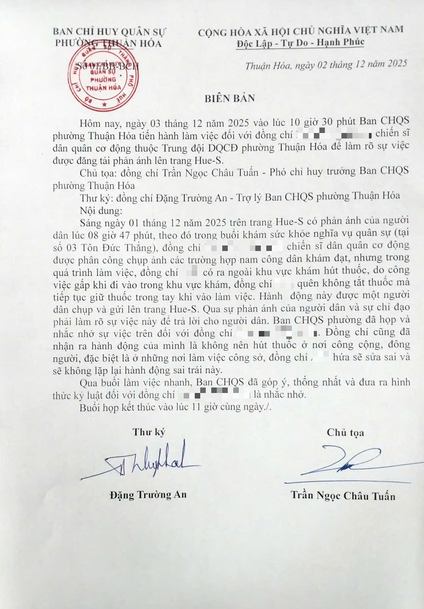 Đối với nội dung này, UBND phường đã chỉ đạo Ban chỉ huy quân sự phường tiến hành xác minh và xử lý đối với cán bộ dân quân có hành vi không phù hợp khi làm việc.