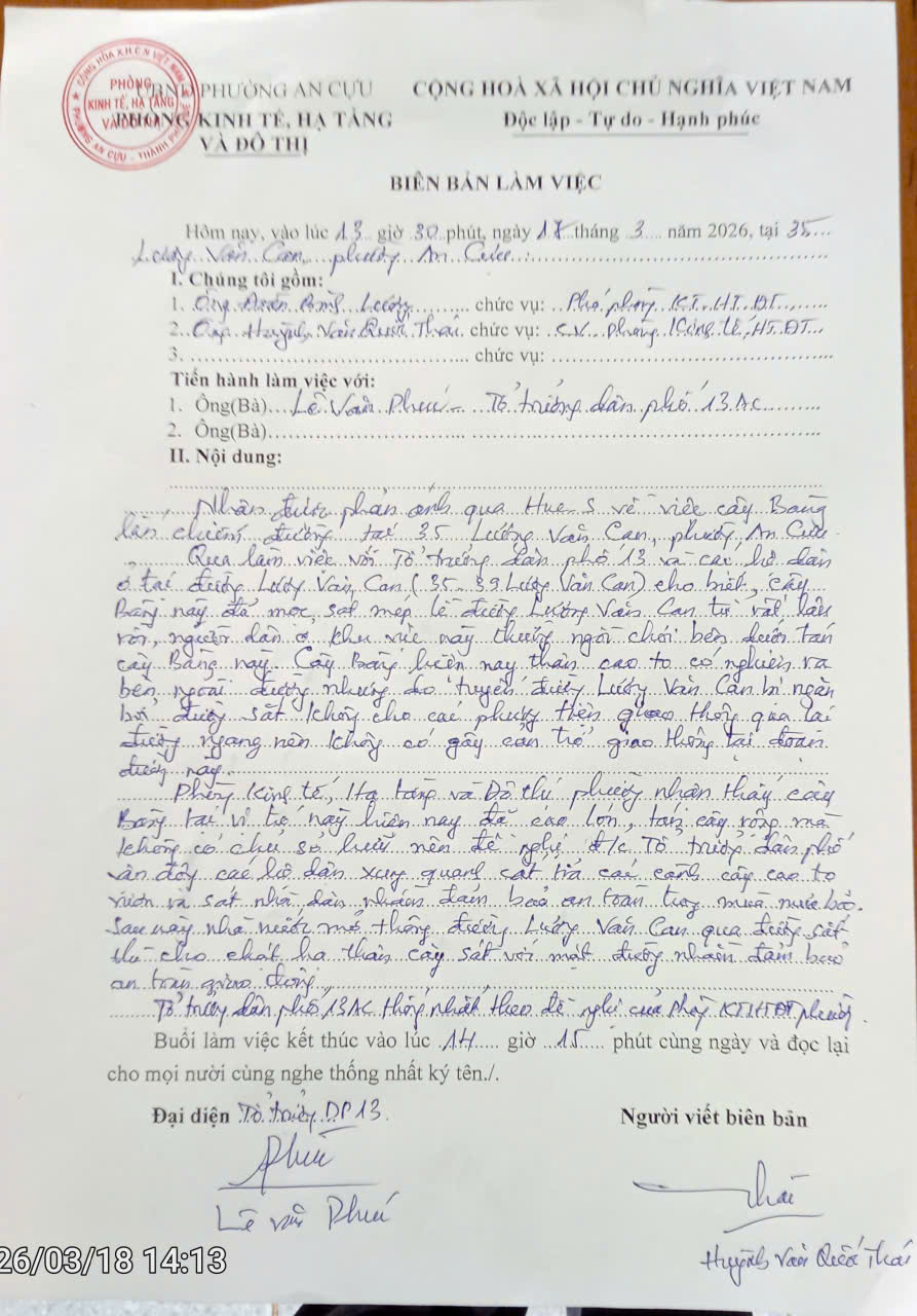 Phòng Kinh tế, Hạ tầng và Đô thị phường đã phối hợp với Tổ dân phố 13 phường An Cựu tiến hành khảo sát thực tế. Qua đó, UBND phường đề nghị Tổ dân phố chủ động vận động các hộ dân xung quanh thực hiện cắt tỉa cây xanh, nhằm đảm bảo thông thoáng tầm nhìn, an toàn giao thông (có biên bản kèm theo).