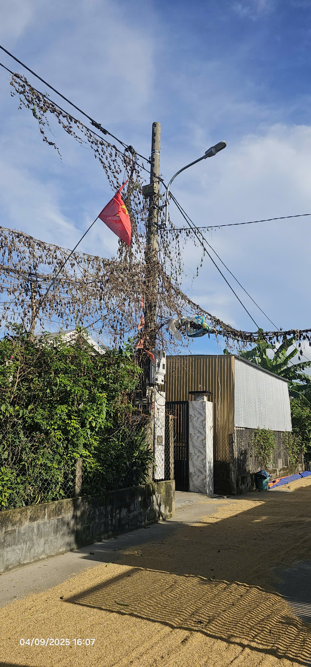 Cây leo phủ kín dây điện tại số nhà 10 kiệt 8 Nguyễn Hữu Dật, phường Kim Long gây nguy hiểm.