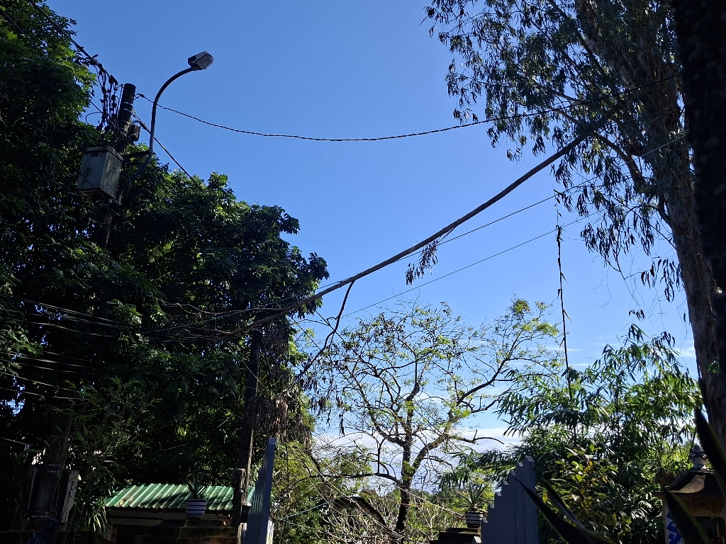 Cây bị đổ đè vào đường dây điện gây nguy hiểm cho các hộ dân sinh sống tại khu vực.