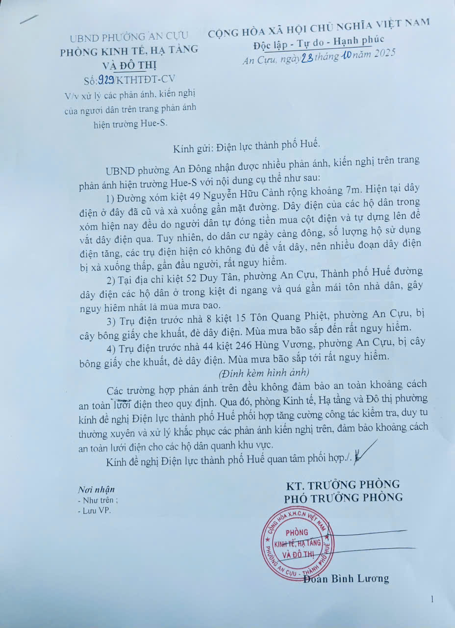 Sau khi nhận được phản ánh, UBND phường đã giao Phòng Kinh tế, Hạ tầng và Đô thị phường An Cựu kiểm tra và gửi công văn đến Điện lực thành phố Huế để phối hợp xử lý các phản ánh, kiến nghị của người dân.