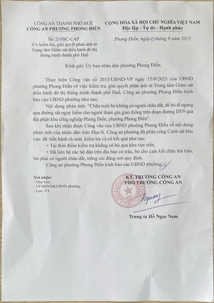 Sau khi nhận được Công văn của UBND phường Phong Điền về nội dung phản ánh của nhân dân. Công an phường đã phân công Cảnh sát khu vực đã tiến hành rà soát, kiểm tra và có kết quả như sau: