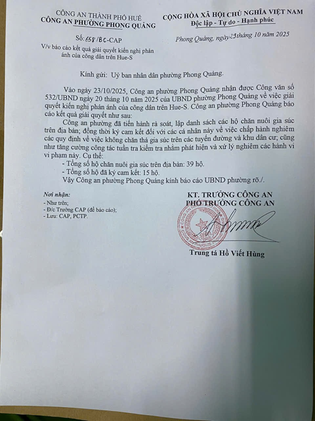 Sau khi tiếp nhận thông tin phản ánh, UBND phường đã chỉ đạo Công an phường tiến hành rà soát và cho chủ hộ chăn nuôi cam kết, tại công văn số 658/BC-CAP ngày 29/10/2025. (Đính kèm văn bản)