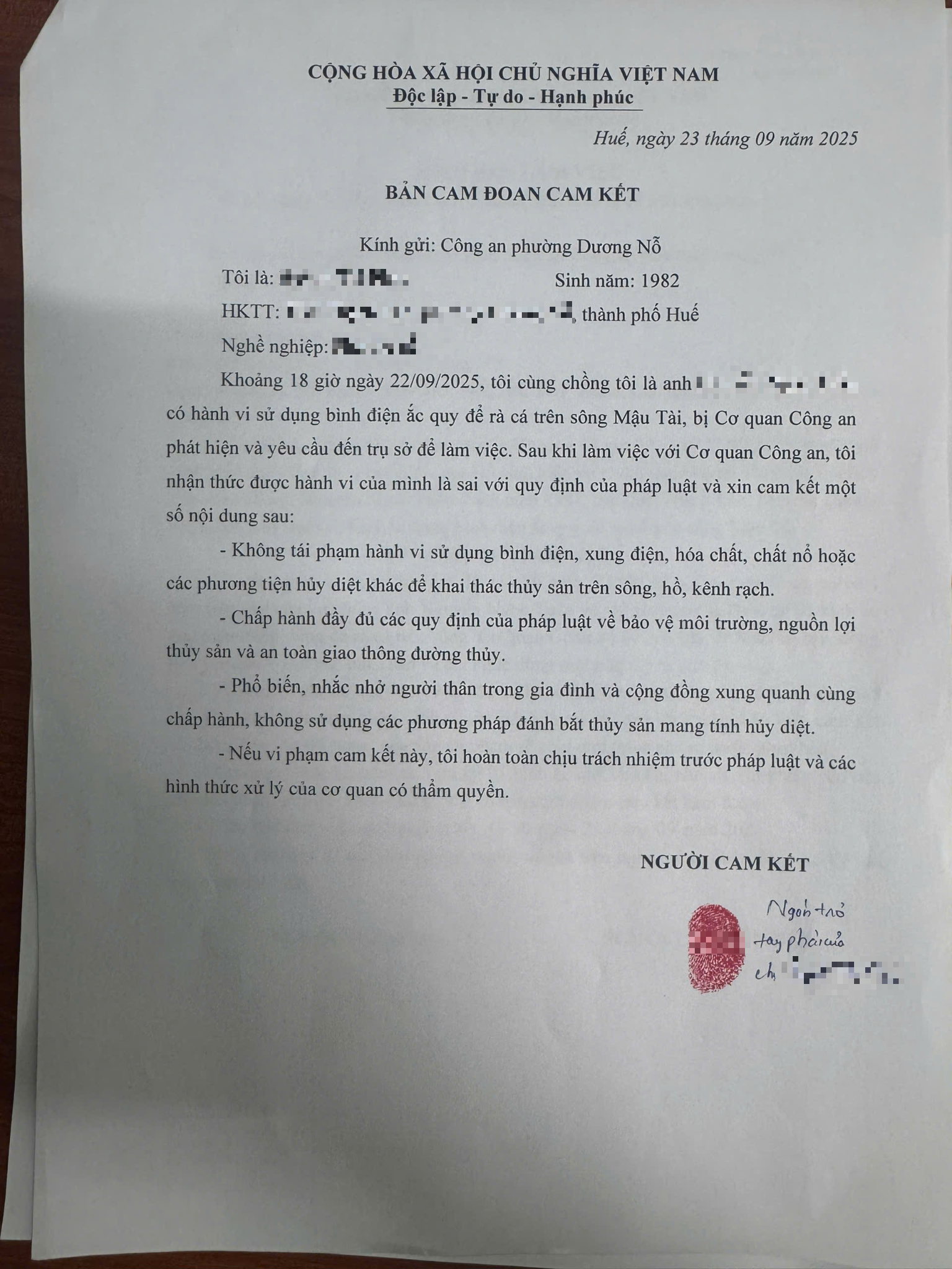 Vào ngày 25/9/2025, Công an phường đã mời ông N.V.C và bà P.T.T.T thường trú TDP Mậu Tài làm biên bản và cam kết nếu tái phạm, sẽ xử lý theo quy định của pháp luật.