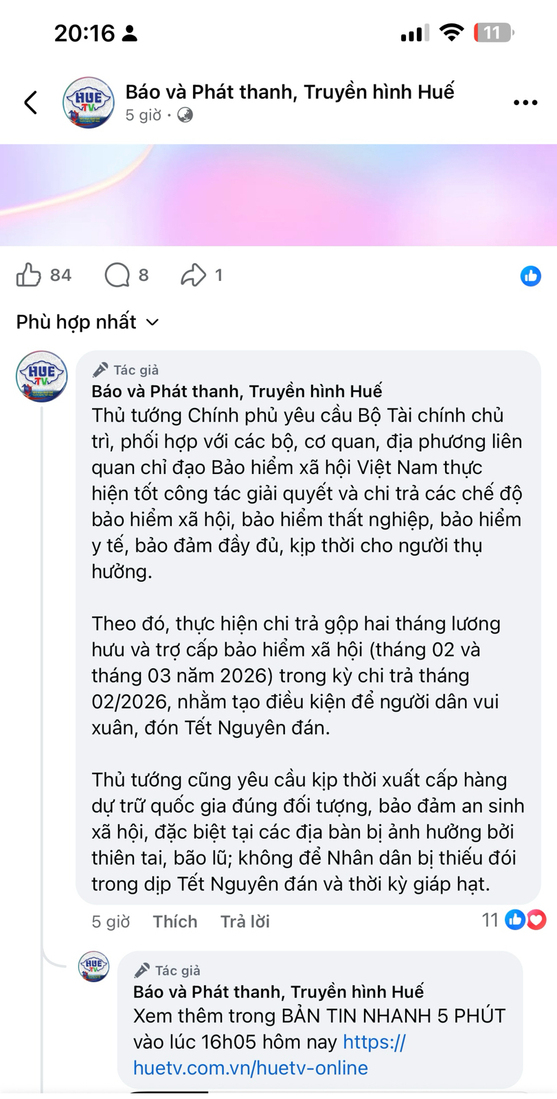 Kính thưa các cơ quan ban ngành. Tôi đọc công văn chủ trương đảm bảo cho người dân nhận bảo trợ xa hội kịp thời, nhưng hiện tại tiền bảo trợ xã hội người già tháng 1 vẫn chưa nhận được. Không biết tình trạng này chậm trễ do đâu, trong khi các ông mệ già cũng cần hưởng kịp thời kẻo tuổi già như ngọn đèn trước gió, hưởng được ngày nào là niềm vui của ông mệ ngày đó ạ! Xin cảm ơn đã tiếp thu ý kiến. Bà Tống Thị Lẽ sinh ngày 18/10/1945. Địa chỉ 30 Ngọc Hồ, phường Kim Long, thành phố Huế.