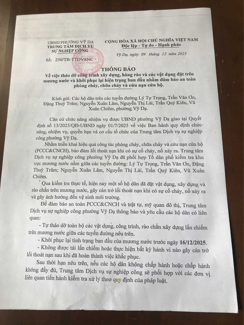 Thực hiện thông báo số 250/TB- TTDVSNC ngày 09/12/2025 về việc tháo dỡ công trình, hàng rào và các vật dụng trên mương nước nhằm đảm bảo an toàn phòng cháy, chữa cháy và cứu hộ cứu nạn.