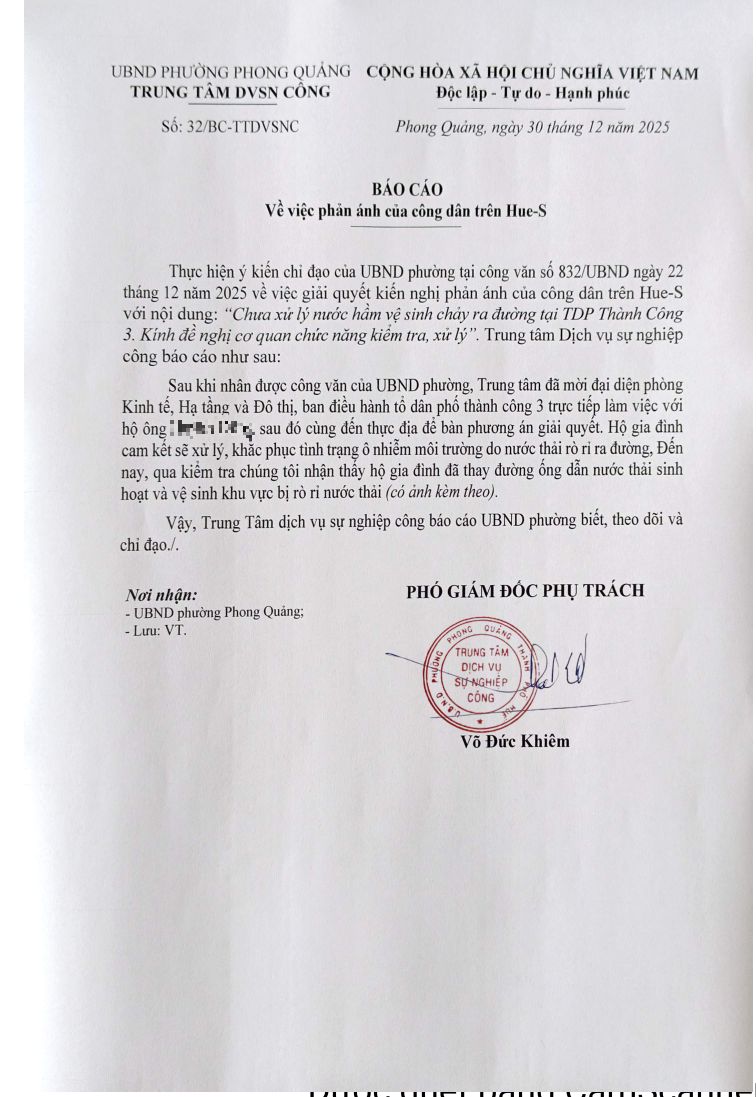Sau khi tiếp nhận thông tin phản ánh, UBND phường đã chỉ đạo Trung tâm dịch vụ sự nghiệp công tiến hành kiểm tra, xử lý phản ánh trên và báo cáo kết quả xử lý số 32/BC-TTDVSNC ngày 30/12/2025. (Đính kèm theo báo cáo và hình ảnh)