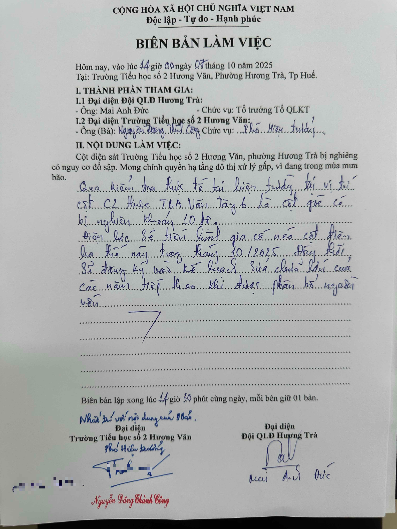 Đội Quản lý điện Hương Trà đã làm việc trực tiếp với đại diện Nhà trường và sẽ xử lý trong tháng 10/2025 (Đính kèm biên bản).