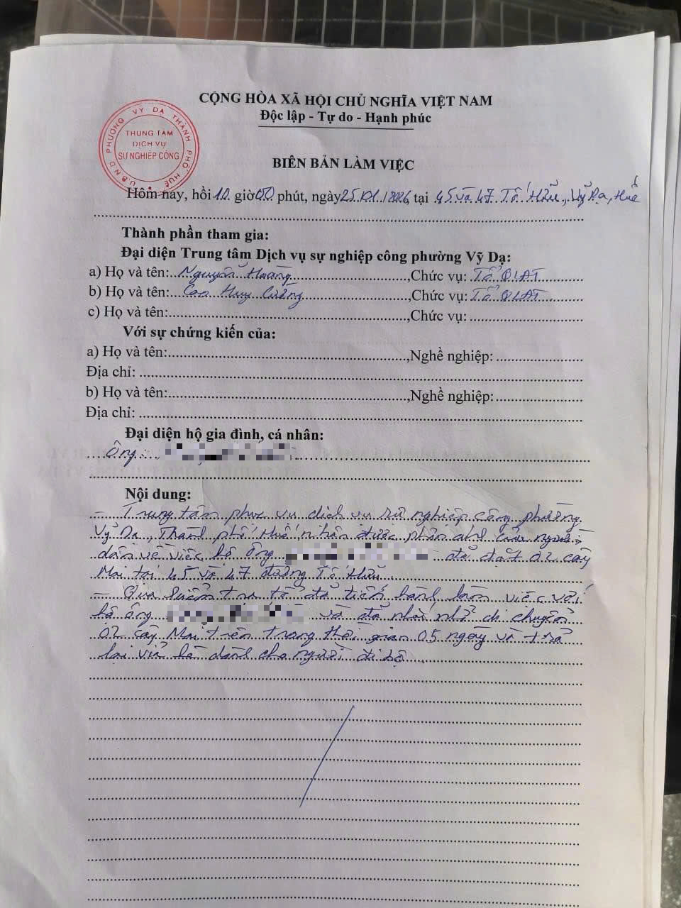 Sau khi tiếp nhận phản ánh, UBND phường Vỹ Dạ đã chỉ đạo Trung tâm Dịch vụ sự nghiệp công tiến hành kiểm tra. Trung tâm đã tiến hành làm việc với chủ hộ, yêu cầu hộ dân di dời việc đặt để lấn chiếm vỉa hè không đúng quy định.