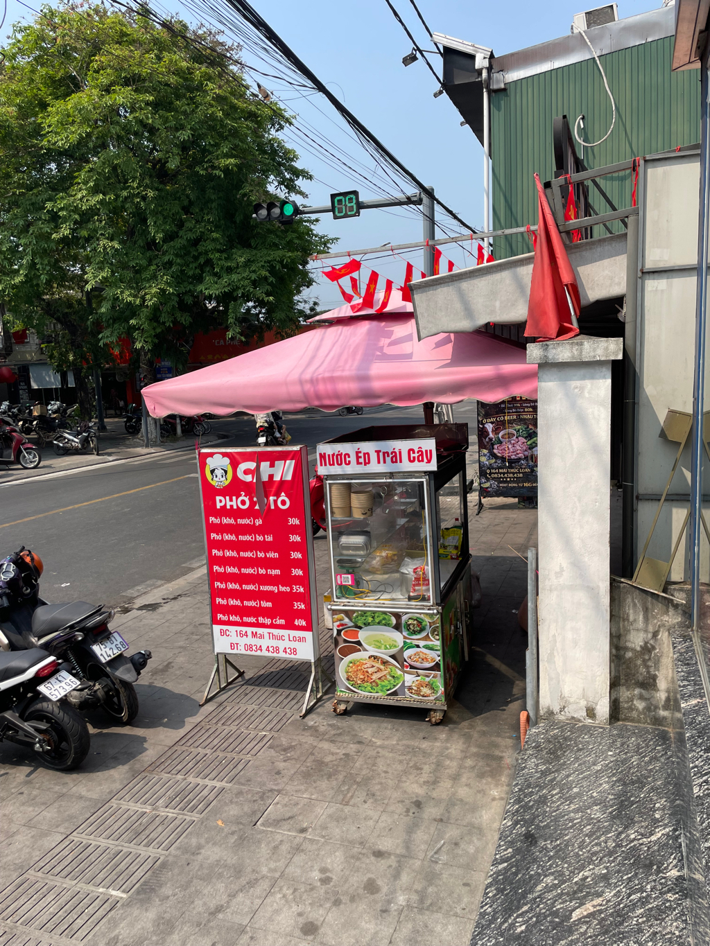 Quán Chi - phở 2 tô tại 164 Mai Thúc Loan ban ngày để bảng hiệu lấn chiếm vỉa hè. Đề nghị xử lý. Thời gian chụp ảnh 9h30 sáng ngày 20/04/2026.