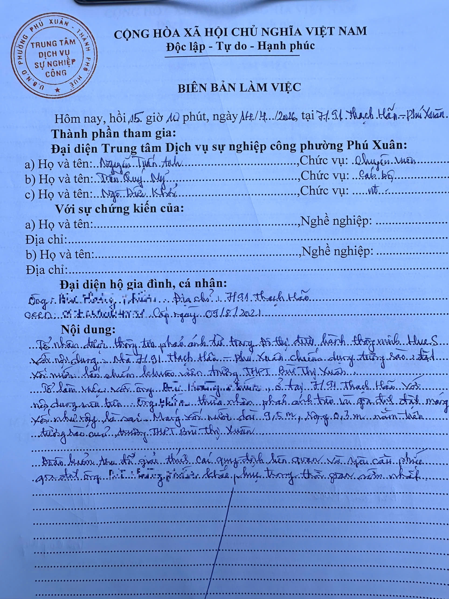 Sau khi tiếp nhận phản ánh, Trung tâm Dịch vụ sự nghiệp công đã cử Tổ công tác tiến hành kiểm tra thực tế tại địa chỉ số 7, kiệt 91 đường Thạch Hãn. Qua kiểm tra, Tổ công tác xác định hộ gia đình ông B.H.P có hành vi chiếm dụng tường rào của Trường THPT Bùi Thị Xuân để lắp đặt máng xối nước với chiều dài khoảng 9,5m, chiều rộng 0,3m.