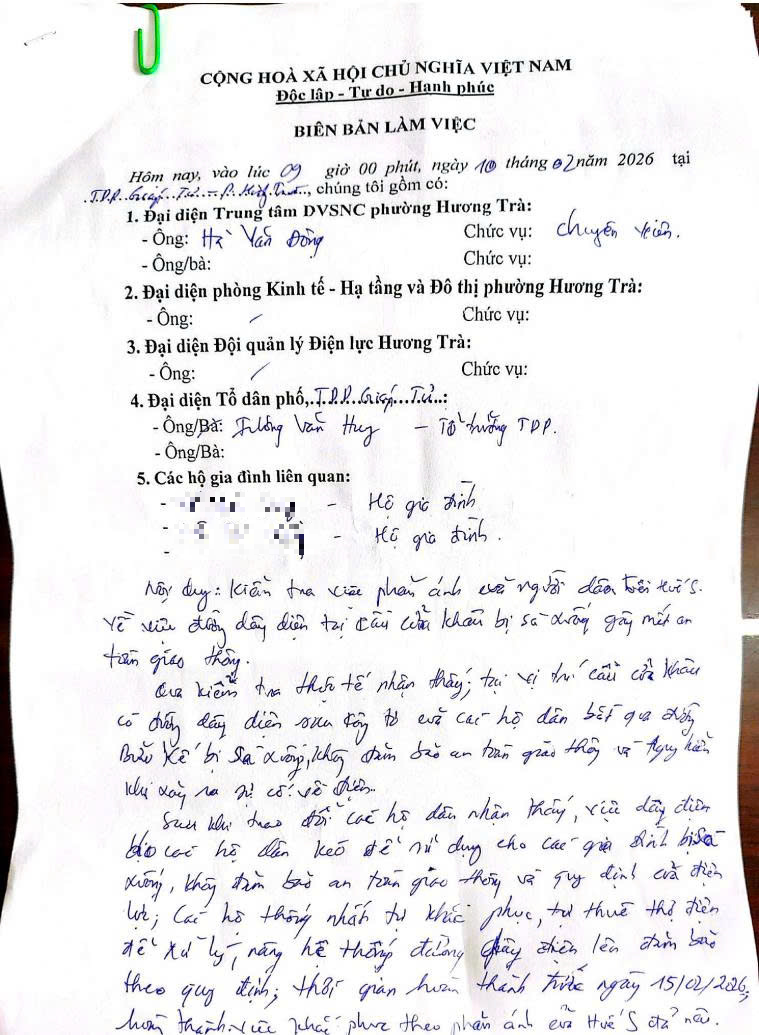 UBND phường đã chỉ đạo Trung tâm dịch vụ sự nghiệp công phường phối hợp với các đơn vị liên quan tiến hành kiểm tra và yêu cầu các hộ gia đình liên quan tiến hành nâng hệ thống dây điện để đảm bảo an toàn theo quy định. (Kèm theo Biên bản)