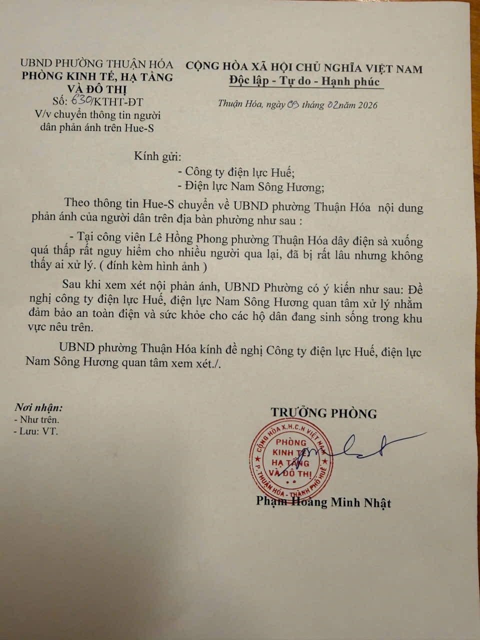 UBND phường đã có công văn chuyển điện lực Nam Sông Hương để giải quyết theo thẩm quyền, theo quy định. (Đính kèm văn bản)