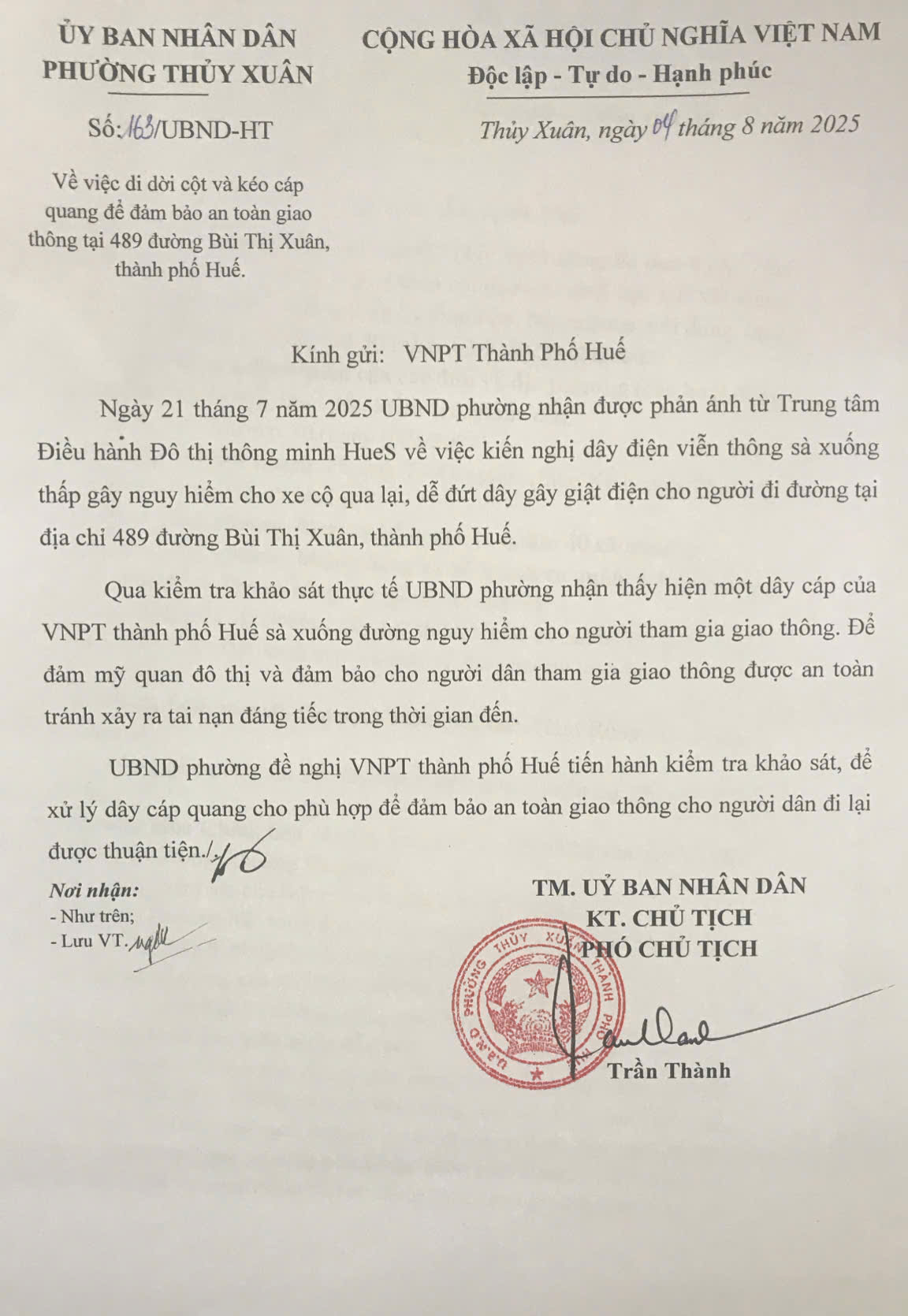 Sau khi nhận được phản ánh về nội dung trên, UBND phường đã có Công văn số 163/UBND HT ngày 04/8/2025 của UBND phường về việc kéo cáp quang để đảm bảo an toàn giao thông tại 489 đường Bùi Thị Xuân gửi cho VNPT thành phố Huế để xử lý.