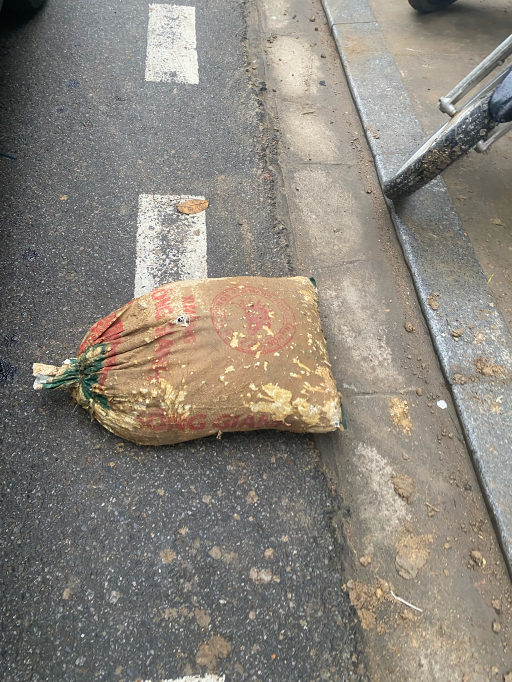 Nhà này đang xây dựng, họ để các bao cát ra ngoài đường, mục đích chắc là không cho xe nào đậu ở đó, việc này khiến cho xe không thể vào đưa đón học sinh trường Lí Thường Kiệt.