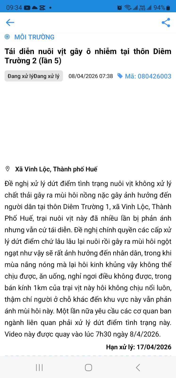 Lý do: Phản ánh của Ông/Bà gửi ngày 08/04/2026 vẫn đang trong thời hạn xử lý.