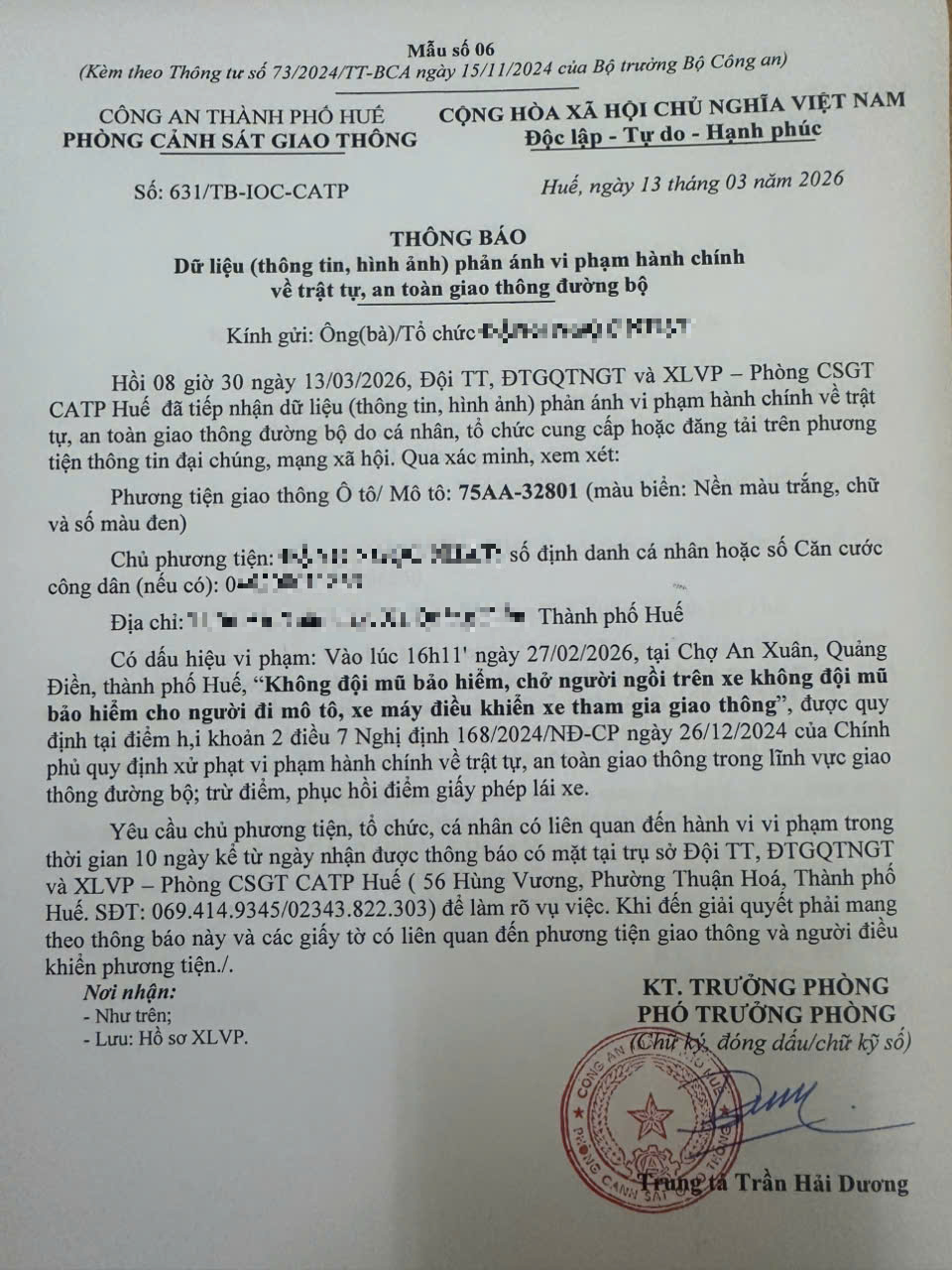 Vấn đề quý Ông/Bà phản ánh, Phòng Cảnh sát giao thông – Công an thành phố Huế đã kiểm tra và xin thông báo kết quả như sau:
