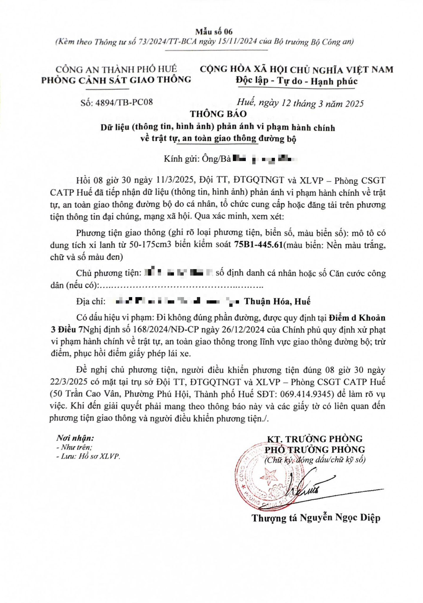 Phòng Cảnh sát giao thông đã gửi thông báo yêu cầu chủ phương tiện đến làm việc. Đồng thời, gửi thông báo đến Công an xã/ phường (nơi thường trú của chủ phương tiện). Tuy nhiên, đến nay chủ phương tiện vẫn chưa đến làm việc theo yêu cầu. Phòng Cảnh sát giao thông sẽ tiếp tục thông báo cho lực lượng tuần tra kiểm soát trên đường phát hiện, xử lý.
