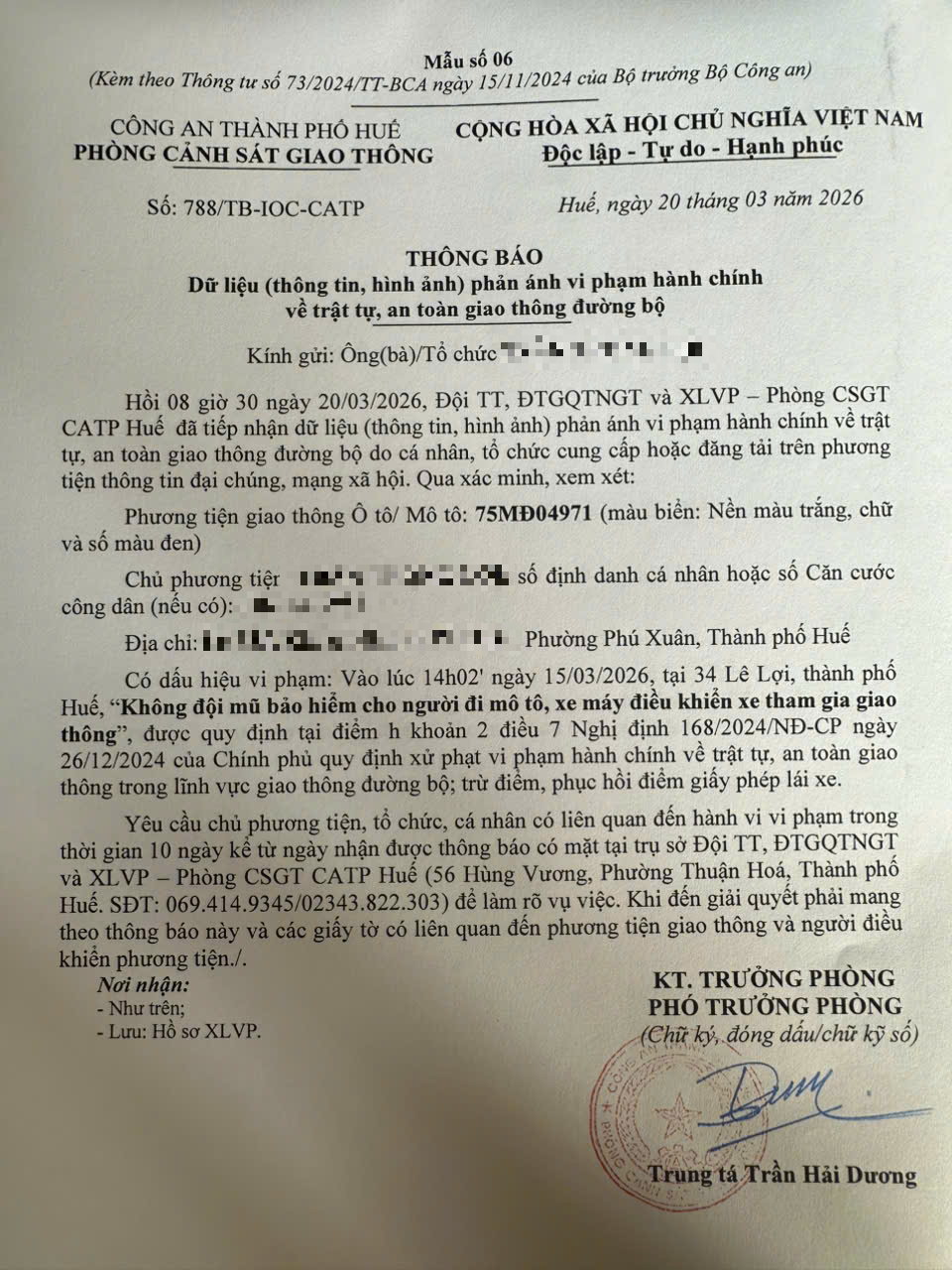Vấn đề quý Ông/Bà phản ánh, Phòng Cảnh sát giao thông – Công an thành phố Huế đã kiểm tra và xin thông báo kết quả như sau: