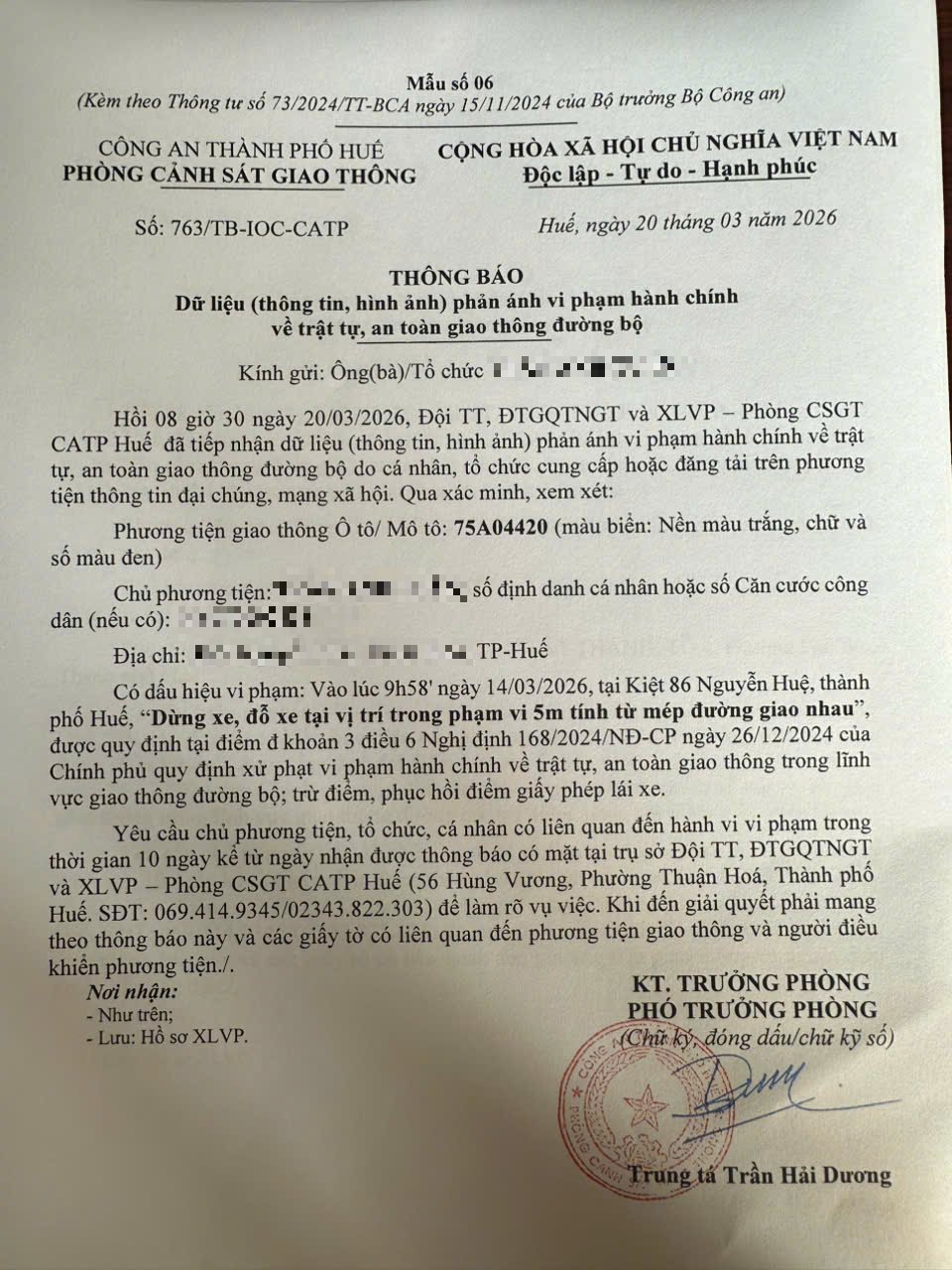 Qua hình ảnh phản ánh, Phòng Cảnh sát giao thông xác định lỗi vi phạm của người điều khiển phương tiện BKS 75A04420 như sau: “Dừng xe, đỗ xe tại vị trí trong phạm vi 5m tính từ mép đường giao nhau”, quy định tại điểm đ, khoản 3, điều 6 Nghị định 168/2024/NĐ-CP.